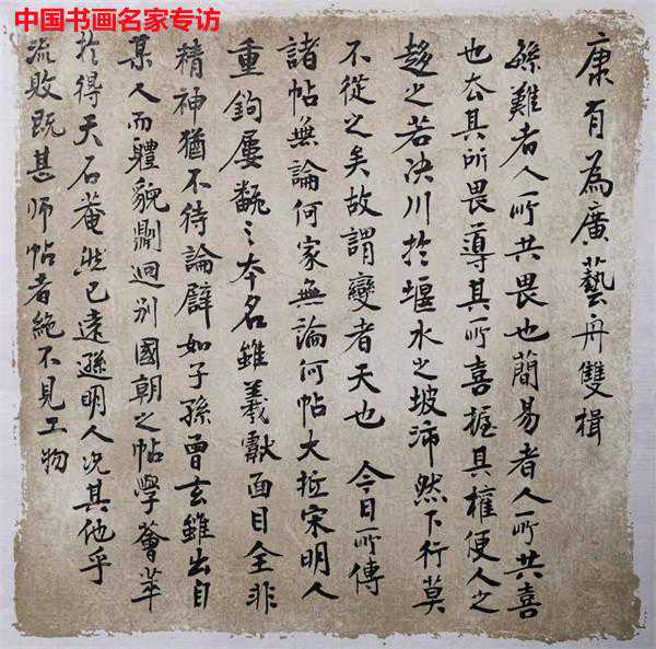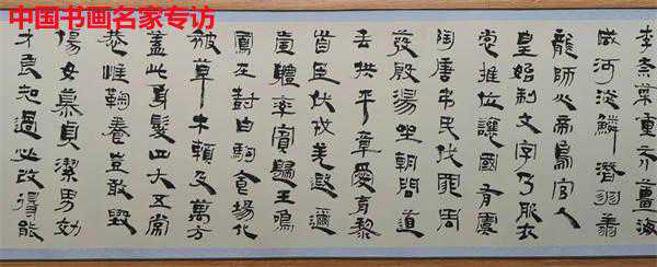 他的书法主攻篆隶,亦擅行草。其隶书,以汉碑为宗,取法张迁,乙瑛、礼器、石门诸碑,兼习秦简、汉帛,融汉碑之拙朴沉雄与简帛之率真飘逸为一体,力避汉碑板涩与简帛浮摇之弊。其行草,私淑米颠,既有《苕溪帖》的侧锋,又有《蜀素帖》的渴笔,流畅中寓生涩,老辣中见精严。