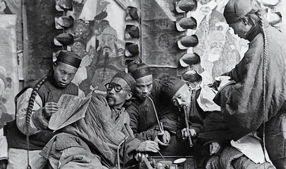 一群教书先生,他们围坐在一起吸食着鸦片。