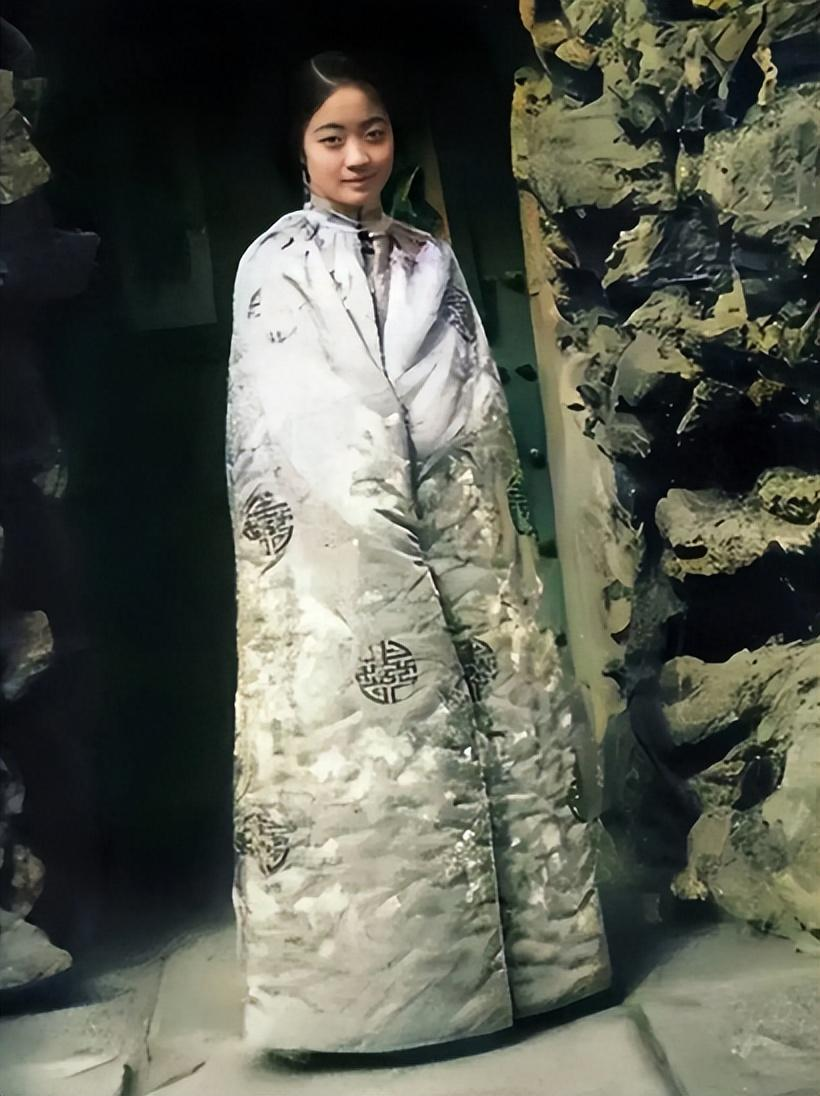 在御花园堆秀山前留影的婉容,见她身披一件棉披风。
