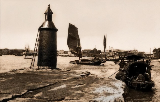 广州珠江边的一个灯塔。河里还有不少帆船。