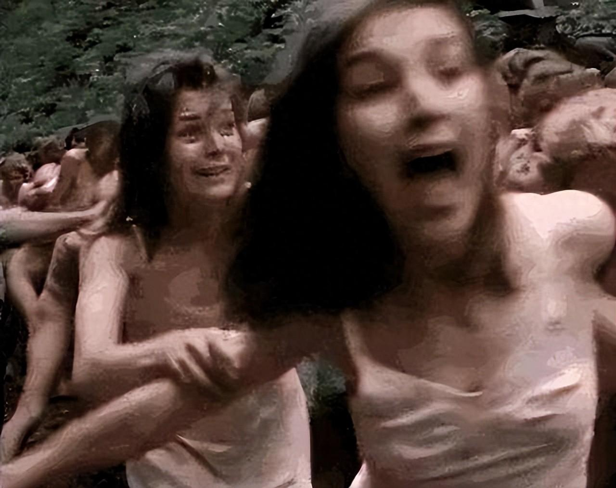 集中营中死去的妇女衣不遮体,一些活着的女人,骨瘦如柴,身体全裸。