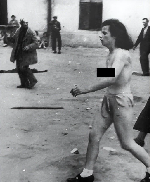 在清理行动中,这些犹太女人不管是在哪里,只要被发现了,就会遭到侮辱和殴打,这个女人被脱掉衣服,走在大街上,边上还有人在远处观看。