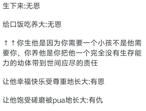 有没有恩,取决于他们是怎么对待自己孩子的。所以啊,父母决定了孩子的出生,就有义务把他抚养到18岁,没资格要求回报。但是父母给予孩子爱和教育,则是恩