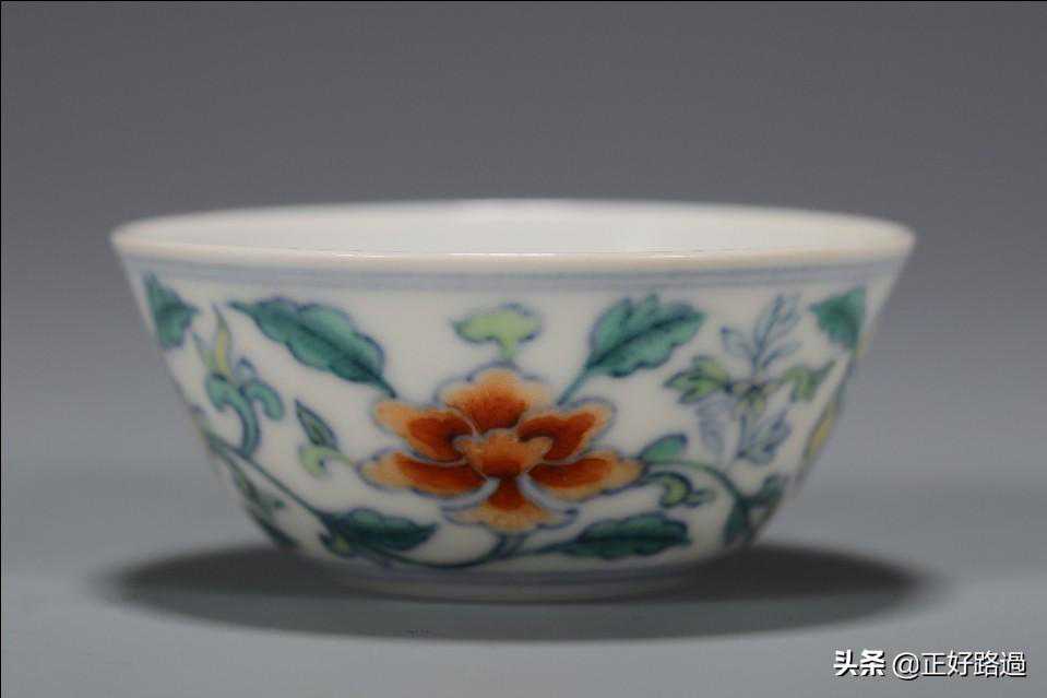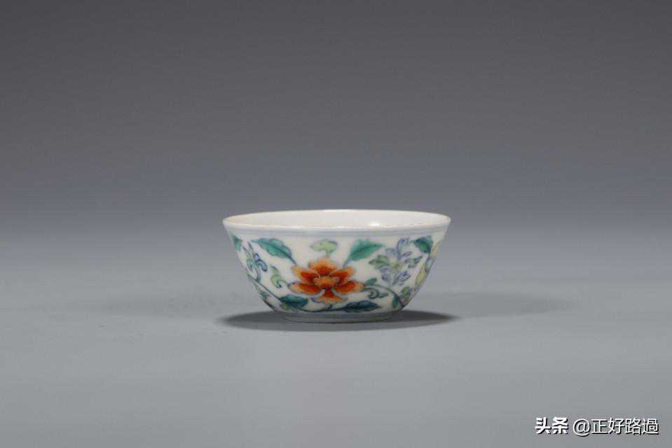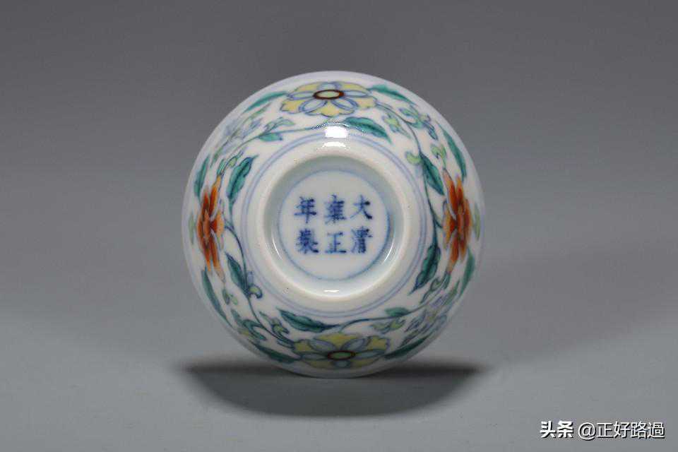 雍正斗彩花卉纹卧足杯(官窑)(《大清雍正年制》款)外腹饰斗彩狸枝花卉纹,红、绿、黄、蓝等色交错呈现,纹饰满布腹壁,但密而不乱,此种花卉图案乃从织锦中借鉴而来,官窑瓷器中称之为“万花献瑞”,富示欣欣向荣、吉祥如意。同样风格的装饰还见于北京故宫藏雍正斗彩花卉纹盖盒。斗彩色泽柔和典雅,青花线条流畅有力。外底心以青花书写《大清雍正年制》六字双行楷书款,字体工整,笔划苍劲有力。