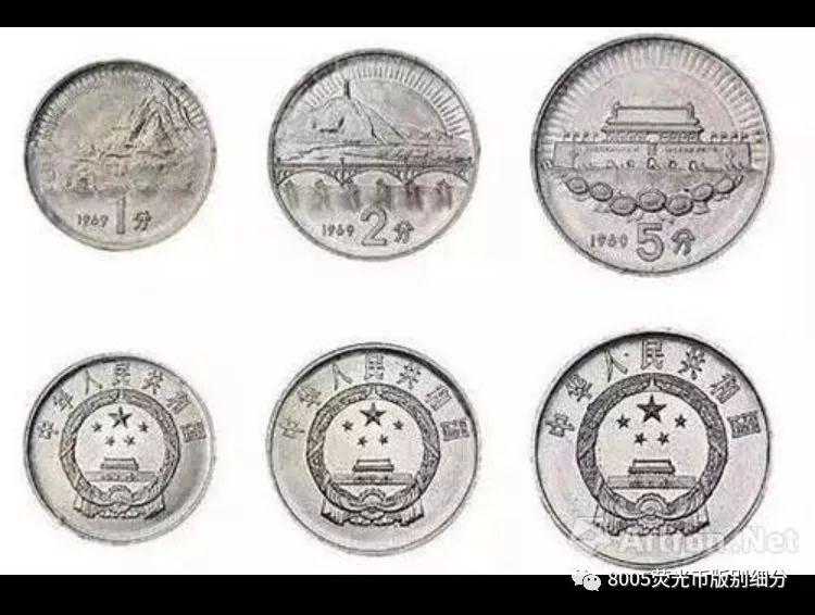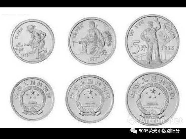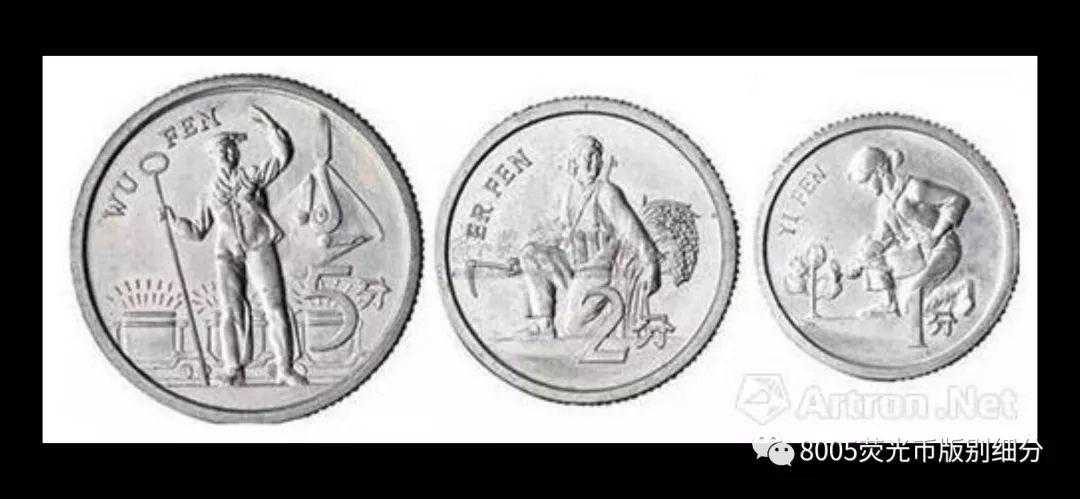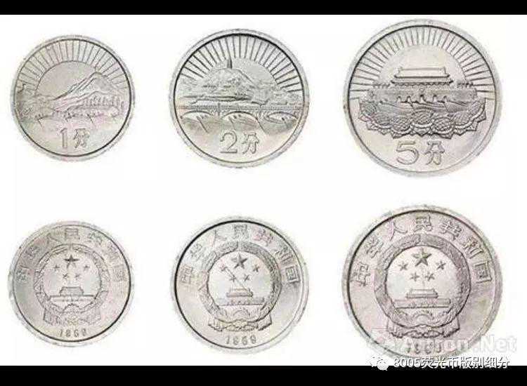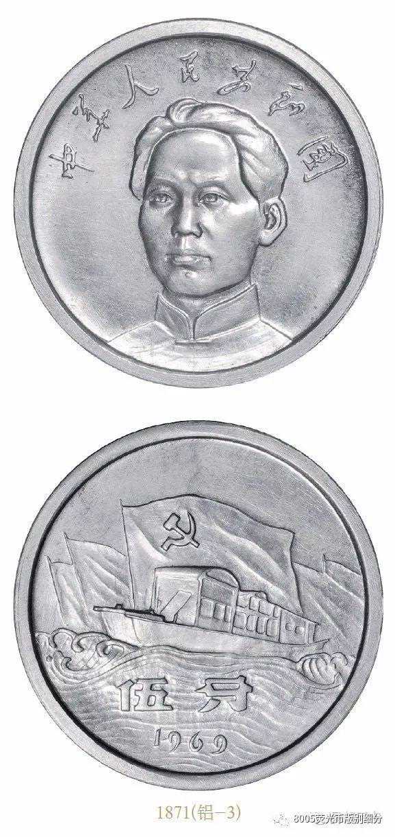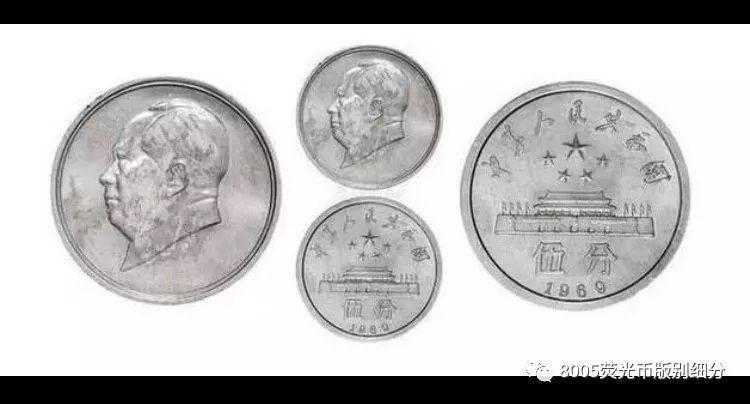 图中的1/2/5分币是在1969年设计的样稿,铝制材料,背面的图案依次为遵义会议遗址、延安宝塔山和天安门。这三枚样币和现在所使用的硬币最大区别,主要是正面图案是以文革时期政治面貌相关。