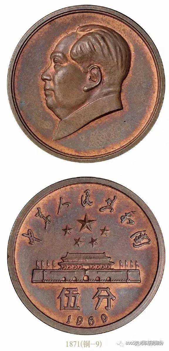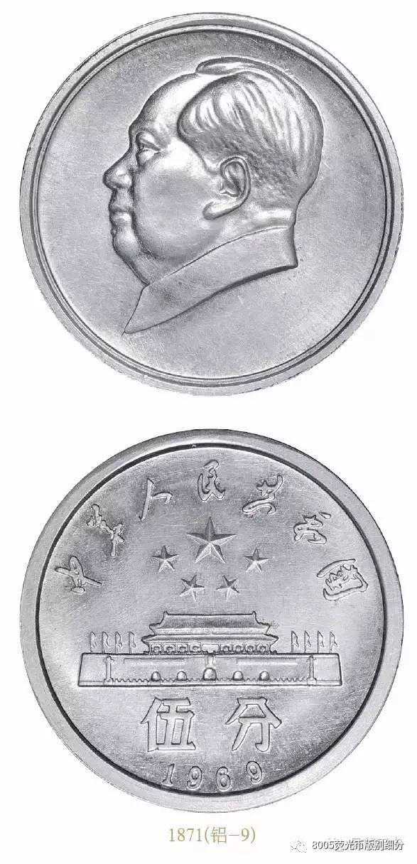 这枚1969年的5分样币没并有官方相关记载,它的正面是伟大毛主席侧面头像,背面是五星照耀下的天安门城楼。