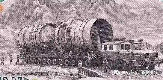1975年印制的2元样币,此时是文革末期。正面是天山的军民横刀立马的英勇形象,背面则是大型物资运输车。