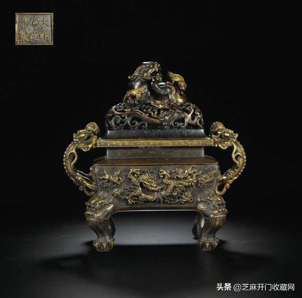 清·铜鎏金双龙耳海龙戏珠熏炉;成交价:RMB1,667,500;尺寸:高25.5cm;长25cm;宽14.5cm