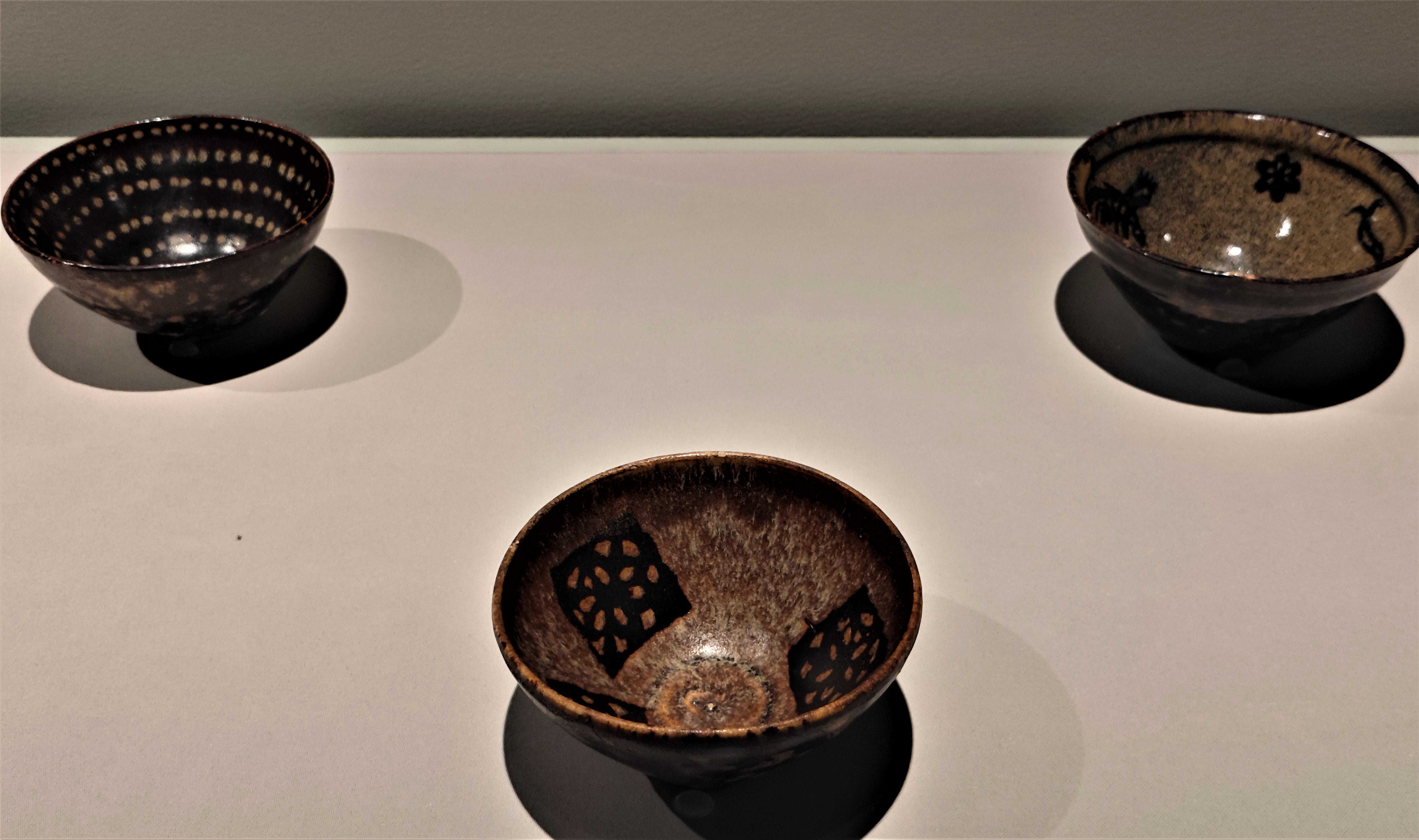 吉州窑玳瑁釉碗(左)、吉州窑黑釉上剪纸贴花纹盏(中)、吉州窑黑釉剪纸贴花双凤纹盏(右)