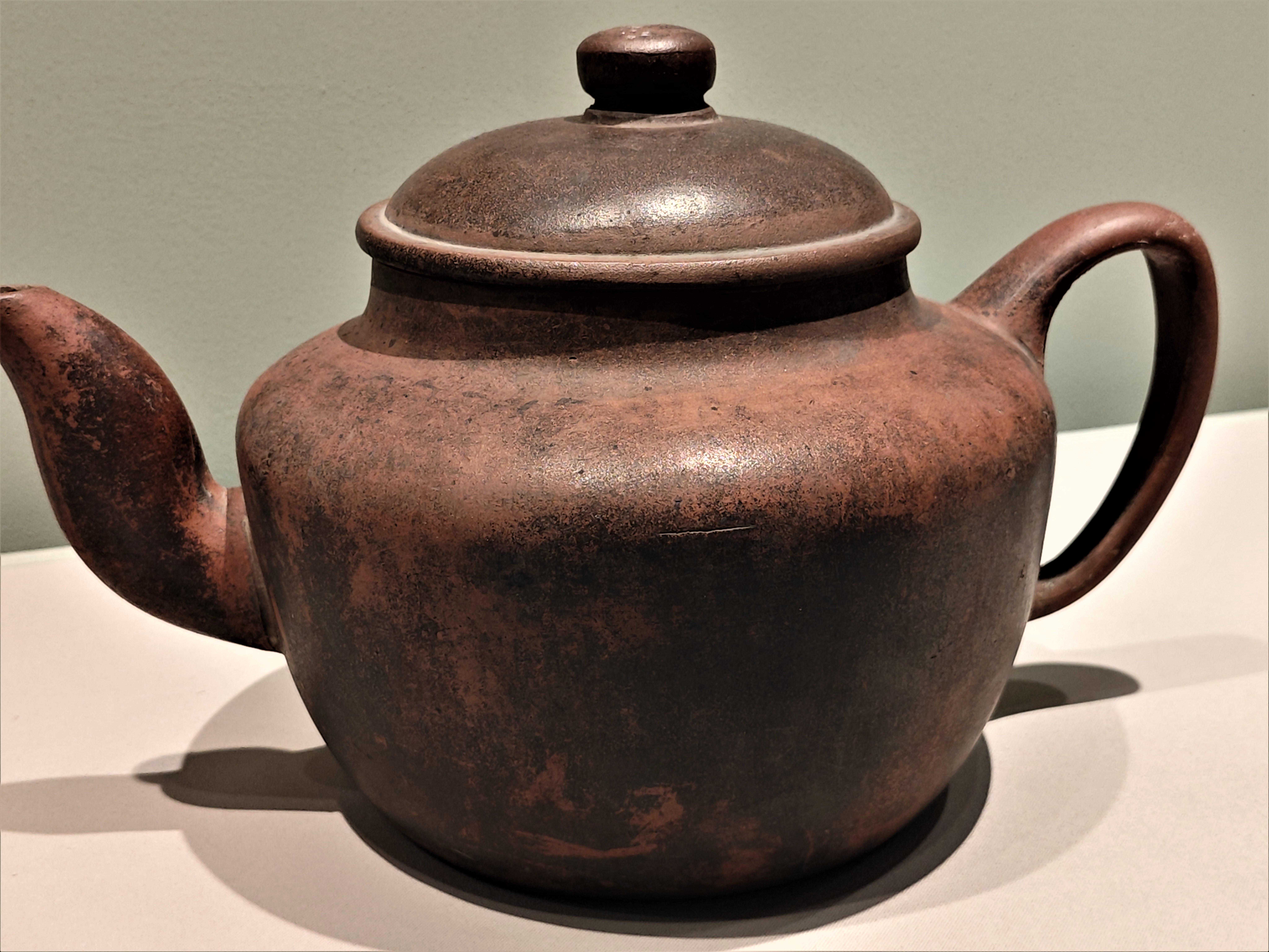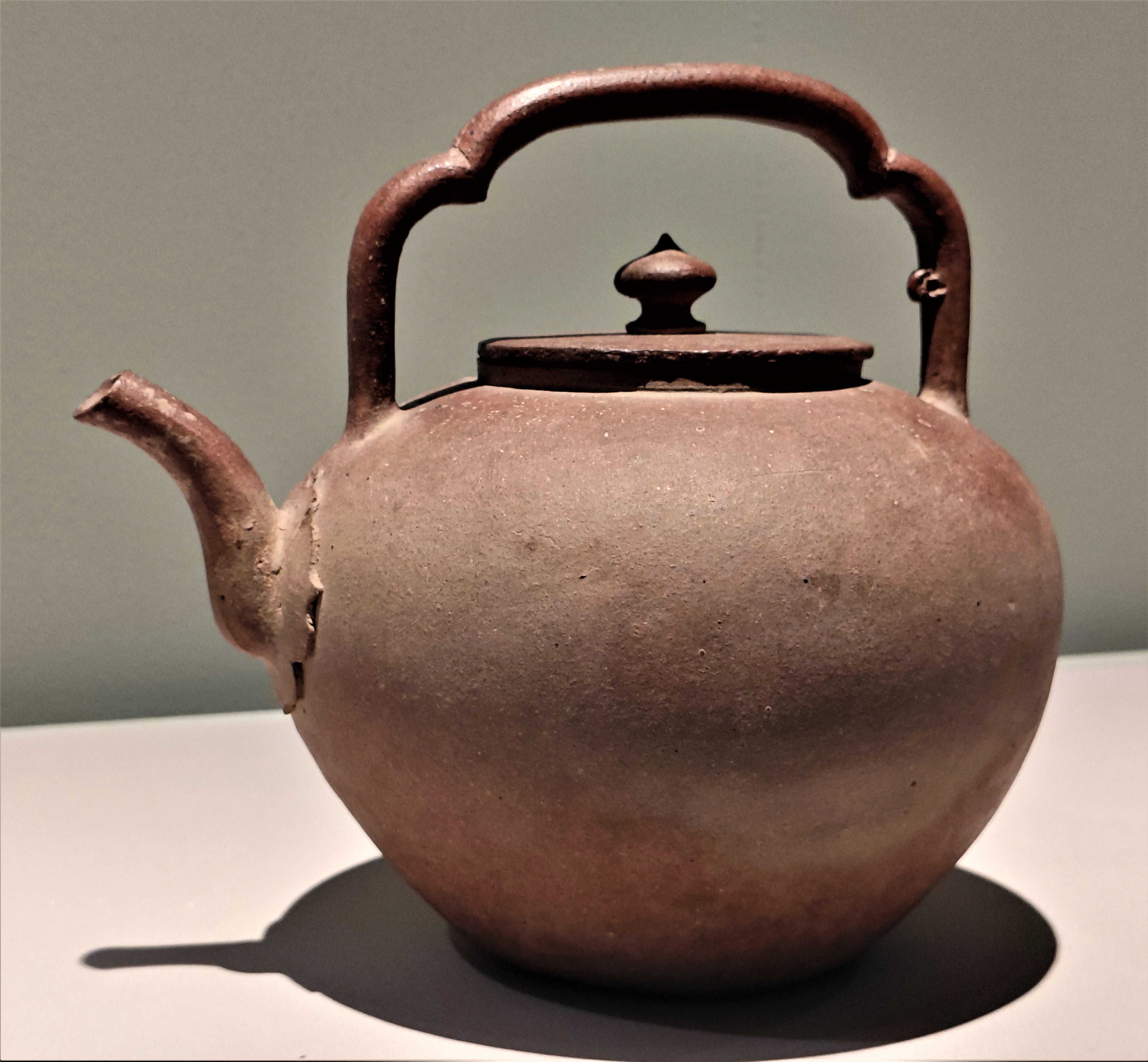 这件出土于江苏南京明代私立太监吴经墓的紫砂提梁壶,制作年代不晚于嘉靖12年(1533年),是目前所见年代可考器物中时代最早的紫砂壶。其弧形与同一时期画家王问所绘《煮茶图》上的提梁弧造型一致,互为对照。