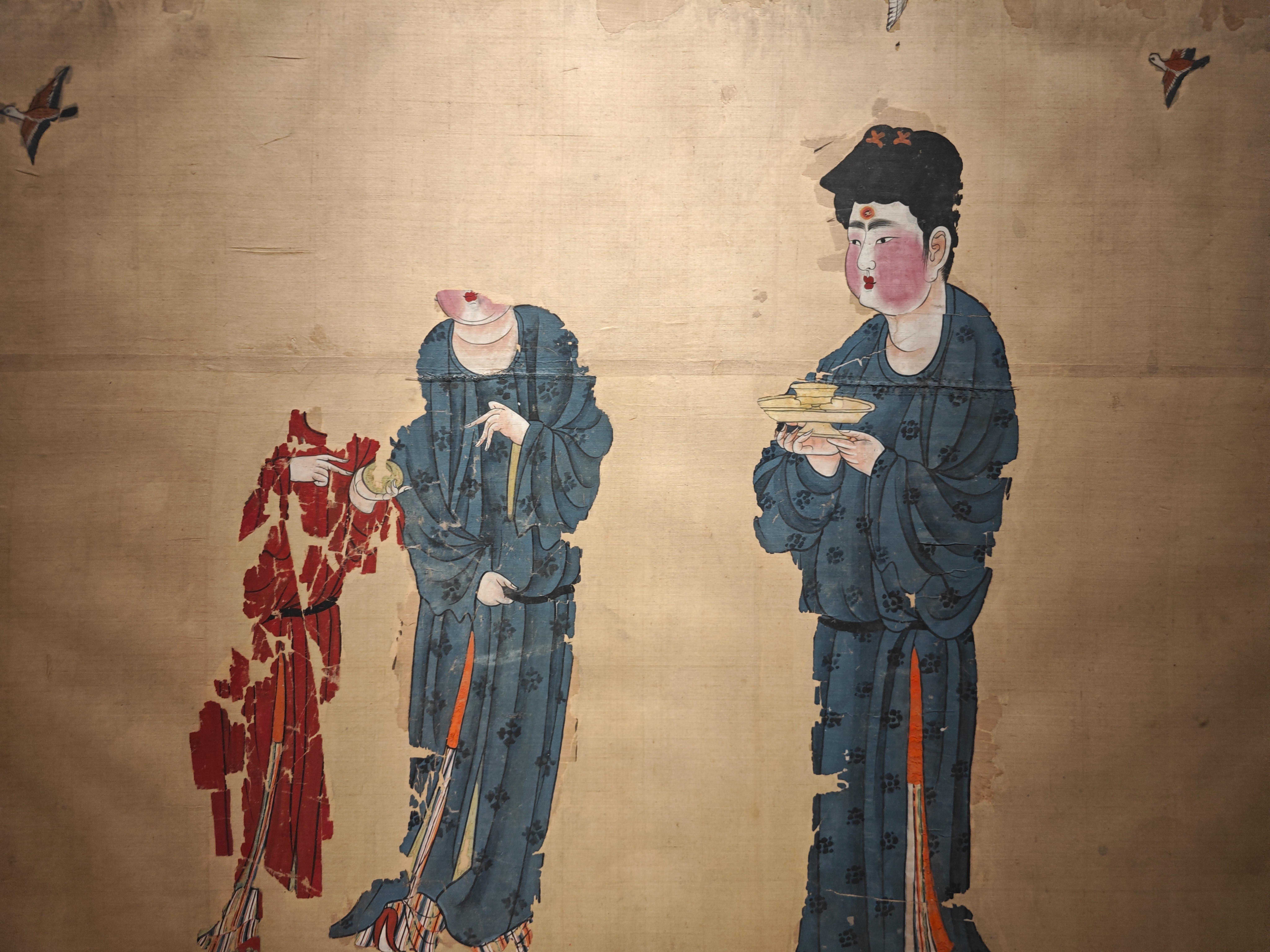 这幅托盏仕女图屏风画,为1972年新疆吐鲁番阿斯塔那187号墓出土。画中共有三位女性人物形象。右边蓝衫侍女,手捧高足托盘,盘上置一盏,似在向主人奉茶。这说明在唐代,饮茶之风已传至中国新疆地区。