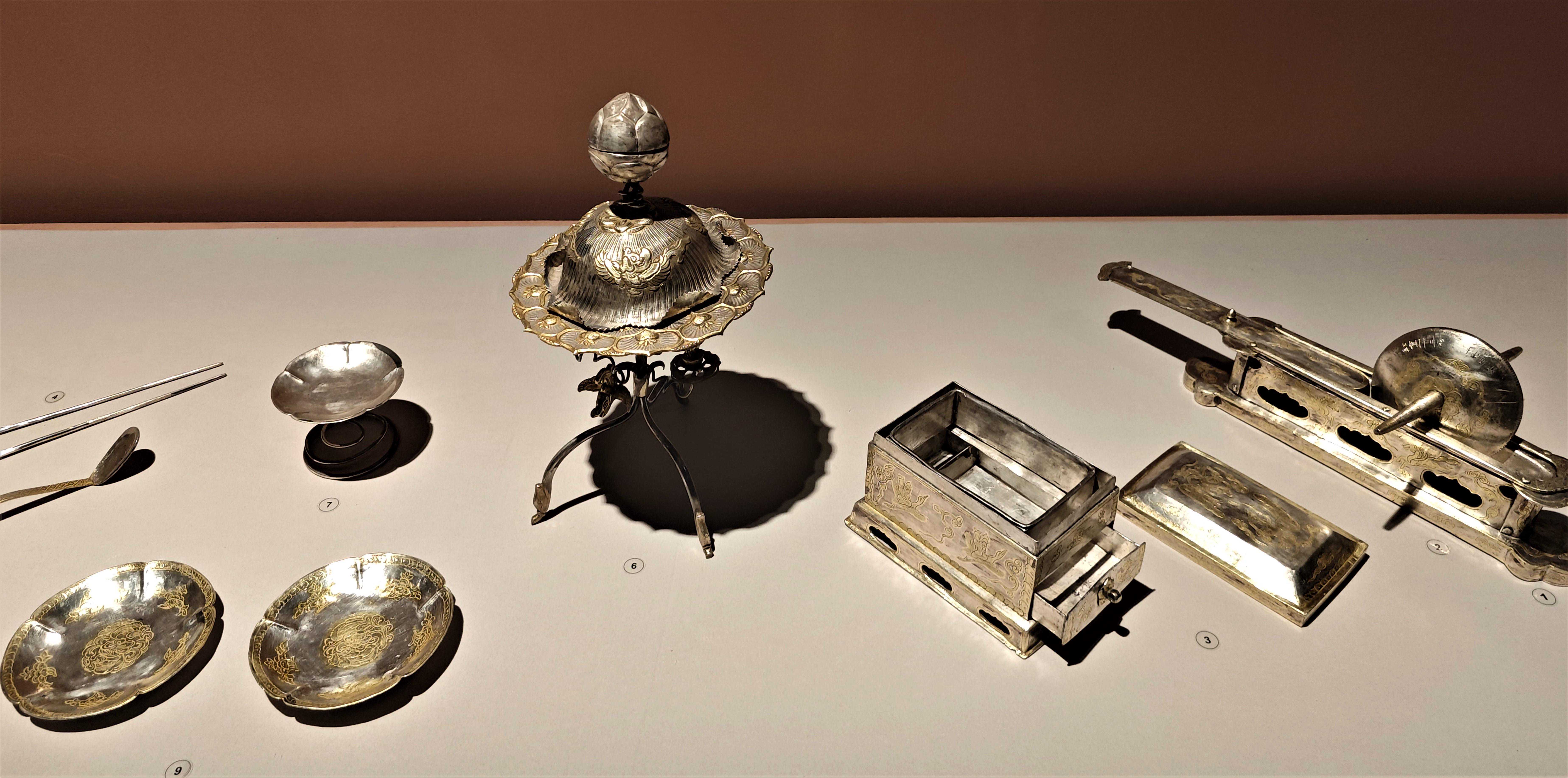 宜兴窑紫砂凸花纹诗文盖罐(左上)、银提梁方火壶(右上)、雍正款斗彩团菊纹盖罐(左下)、金爵(右下)