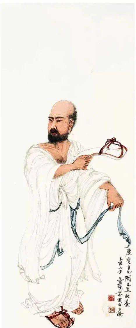 邓芬绘画,尤以人物画最显笔精墨妙,不让古贤。古人高士、佛像罗汉、仕女丽人,皆出尘脱俗,以书入画,线条能放能收,吸收了宋人梁楷及明人陈老莲等前贤之长,去尽清代人物画柔弱之表现手法,呈生气勃勃之态。