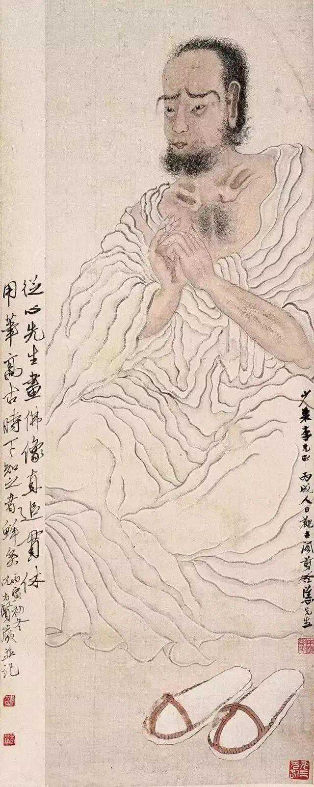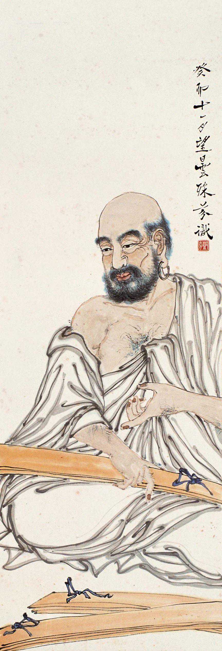 张北如少时在老师容漱石家见过邓芬,了解邓芬用线之高妙,遂认定为真迹。画作经重新装裱,知是画于香港九龙唐氏六如居,为1947之作,疏狂豪放,于其释佛题材画中已臻上乘。