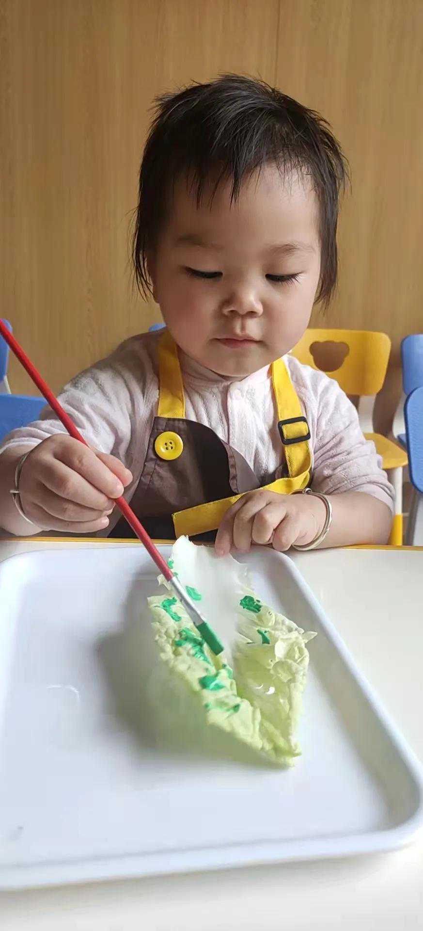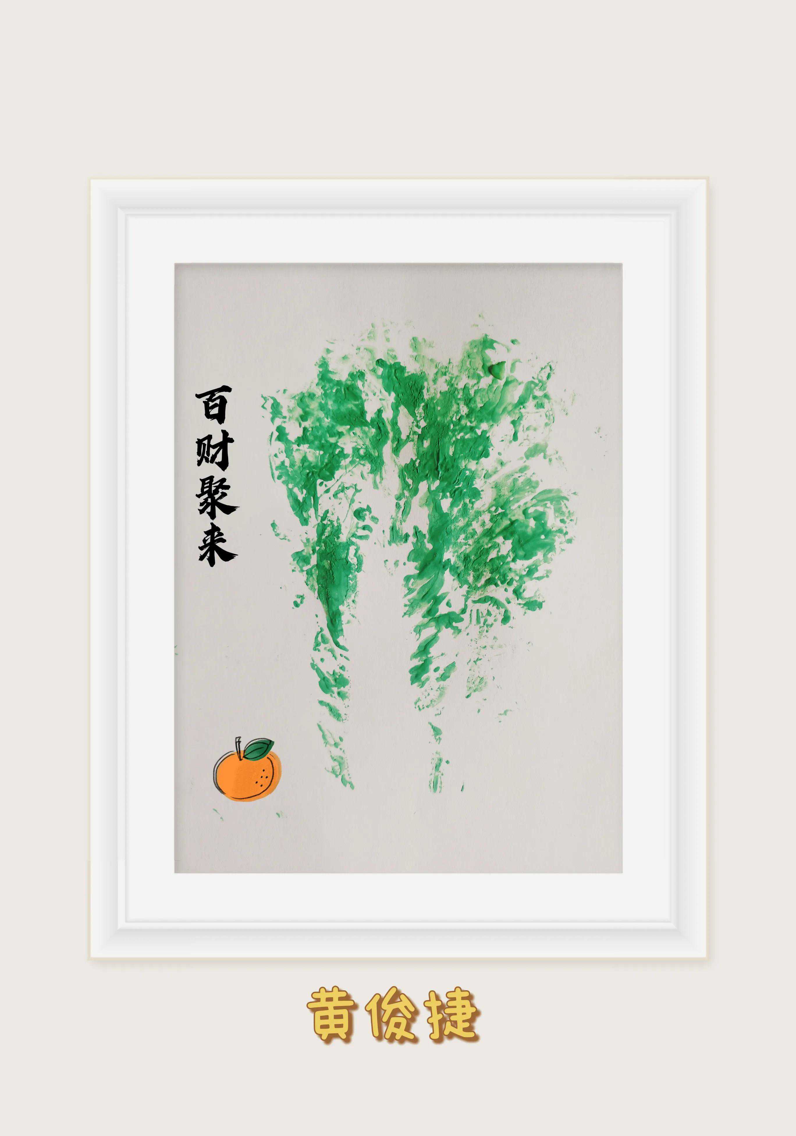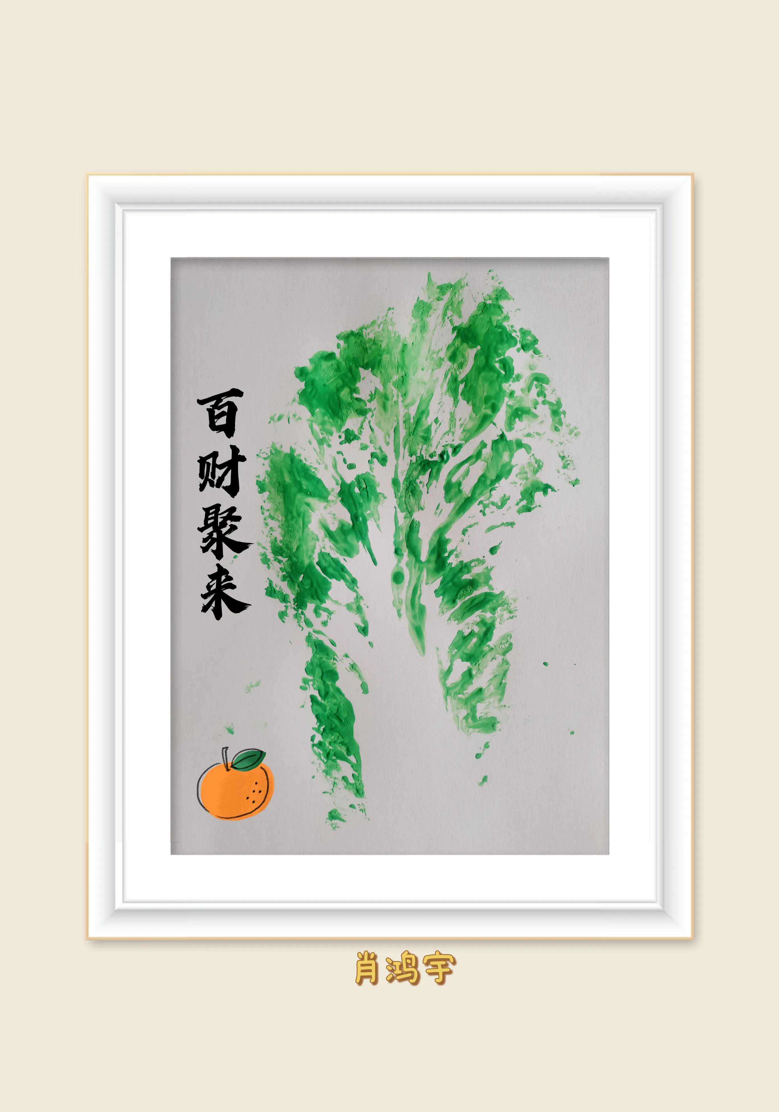 先取一颗完整的白菜,然后再白菜叶上涂上绿色的颜料,后面再拓印到白纸上面,这样一副漂亮的百财聚财图就出来咯!
