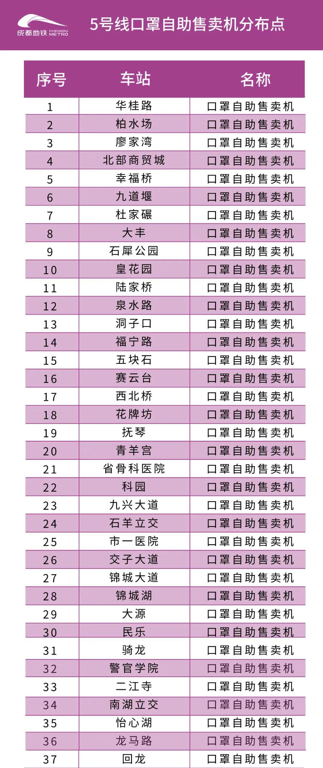 5号线华桂路站柏水场站廖家湾站北部商贸城站幸福桥站九道堰站杜家碾站大丰站石犀公园站皇花园站陆家桥站泉水路站洞子口站福宁路站五块石站赛云台站西北桥站花牌坊站抚琴站青羊宫站省骨科医院站科园站九兴大道站石羊立交站市一医院站交子大道站锦城大道站锦城湖站大源站民乐站骑龙站警官学院站二江寺站南湖立交站怡心湖站龙马路站回龙站