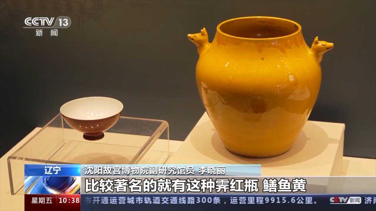 沈阳故宫博物院副研究馆员李晓丽:这里展出的就全部都是“唐窑”的瓷器,“唐窑”就是唐英在任督窑官时管辖下的御窑厂烧造的瓷器。他曾经创烧57种仿古创新瓷,比较著名的就有这种霁红瓶、鳝鱼黄、霁青、白釉、黄釉,还有三鱼碗。
