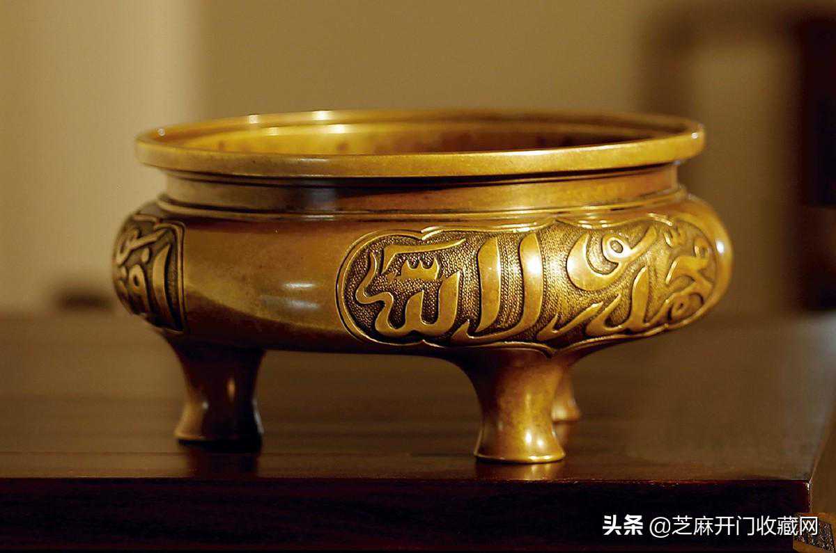 明大明宣德五年款铜阿拉伯文三足炉,尺寸:髙11厘米;口径20.5厘米;重5908g,成交价:RMB1,955,000