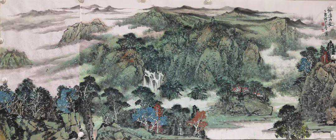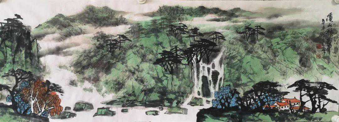 观“狄家山水”有别具一格的新意之感!这种新,不是用西画改良中国画的新意,也不是在技法上“喷水”“喷墨”困兽犹斗般无奈涂鸦的所谓新意,而是将感性线条和多姿斑斓的色彩,通过笔墨融通文脉之中,汇聚山水灵气呈现在丹青之上的新意与遐思。《太行雄姿》《吕凉山色》《板山之春》《物华金山》《阳春烟景》中便有此境界。