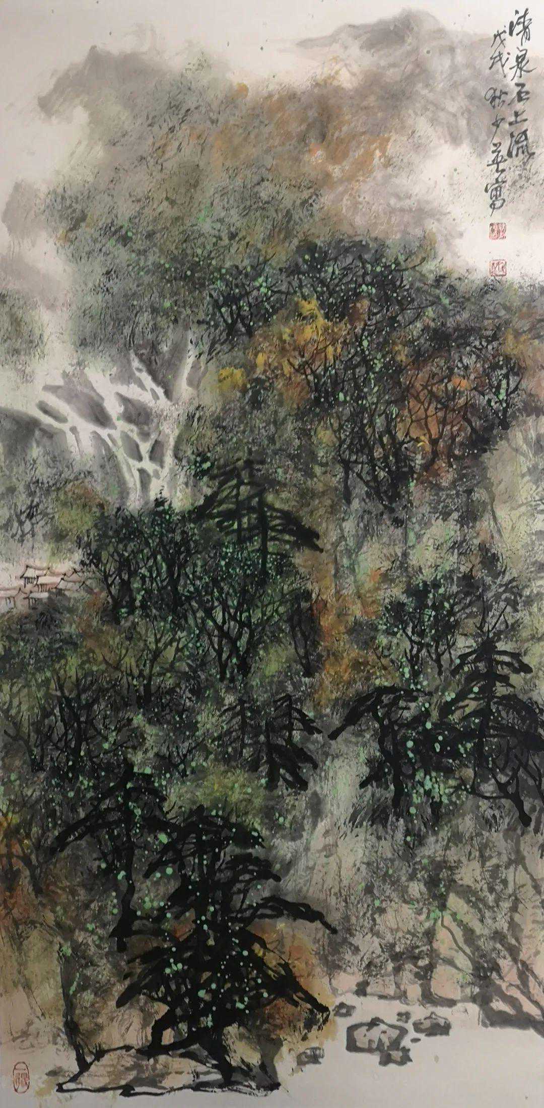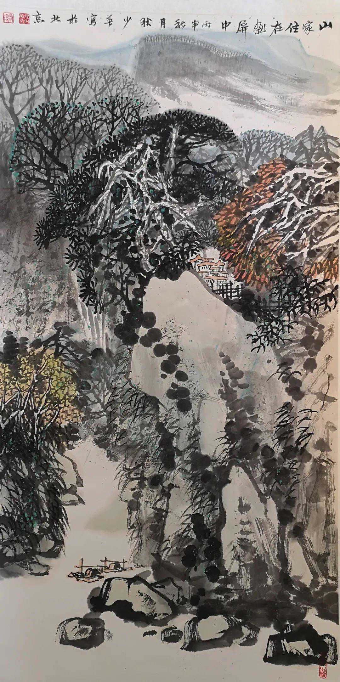 从狄少英先生的山水代表作《家在山水间》《山里人家》《云起山更幽》《阳春烟景》中,可以看到笔墨线条流畅和力透纸背相互结合,将人工化的自然与自然造化的本然综合表达,将至情至性传达到观赏运用得恰到好处,又有近处一树一石的远近现实。似乎观者可以拾级而上“作画中人”了!客观与主观,远观与近赏在同频共振中,传递“狄家山水”之“气”充盈且绵长的生命力。
