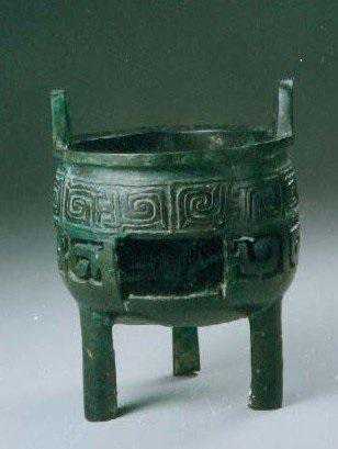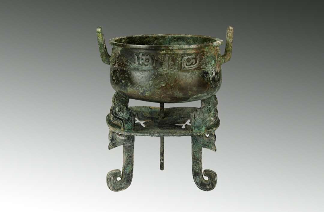窃曲纹温鼎现藏于陕西省周原博物馆。这个圆形温鼎有两个方形大耳,口沿下有曲纹环绕一周,鼎下部空间放置炭火,再一个方形灶口,无门,三根柱状足支撑着鼎身。此温鼎缺乏排烟锚口,工艺水平相对不成熟。