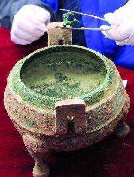2010年11月,在陕西西安咸阳机场二期考古工地上,清理出一座距今2400多年的战国时期秦墓。在墓的壁龛中发现了一件青铜鼎、一件青铜钟和一件漆器残件。此鼎高20、腹径24.5厘米,有盖。更神奇的是,器物内竟然还有半鼎骨头汤。骨头经鉴定,被认定是狗骨,证明这是一锅狗肉汤,被趣称为“狗肉火锅”。
