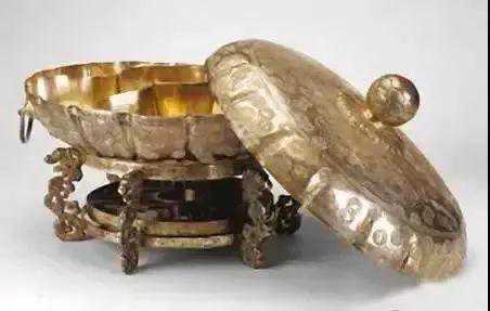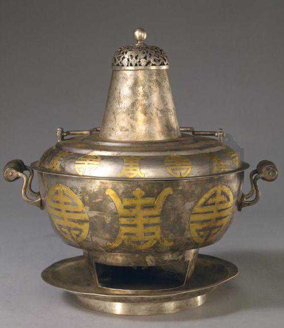 上图是明早期银火锅:火锅盖上有“大明洪武元年造”铭文,火锅身上刻有“子孙满堂”,“喜鹊落眉梢”的铭文,制作得十分精细。