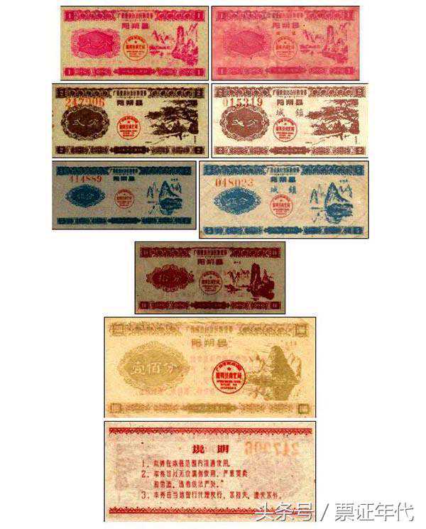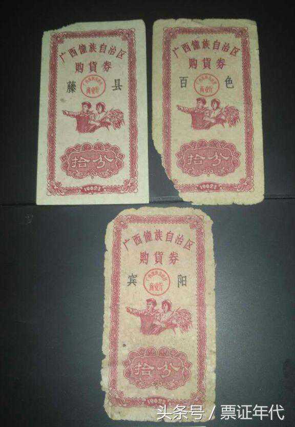 广西壮族自治区的购货券,基本上都是4枚一套,面额分别是:壹分、贰分、伍分、拾分。据不完全统计,有73种加盖不同地区的购货券,也有可能还要更多。