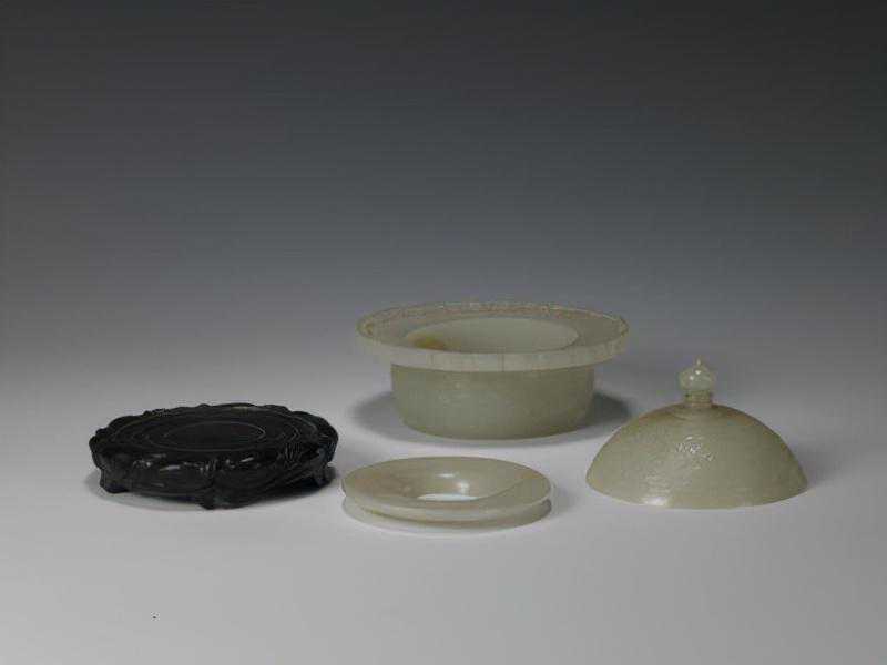 银盖托白玉碗,清,通高11cm,口径9.4cm,足径4.9cm。