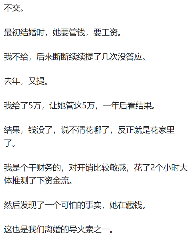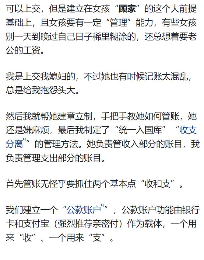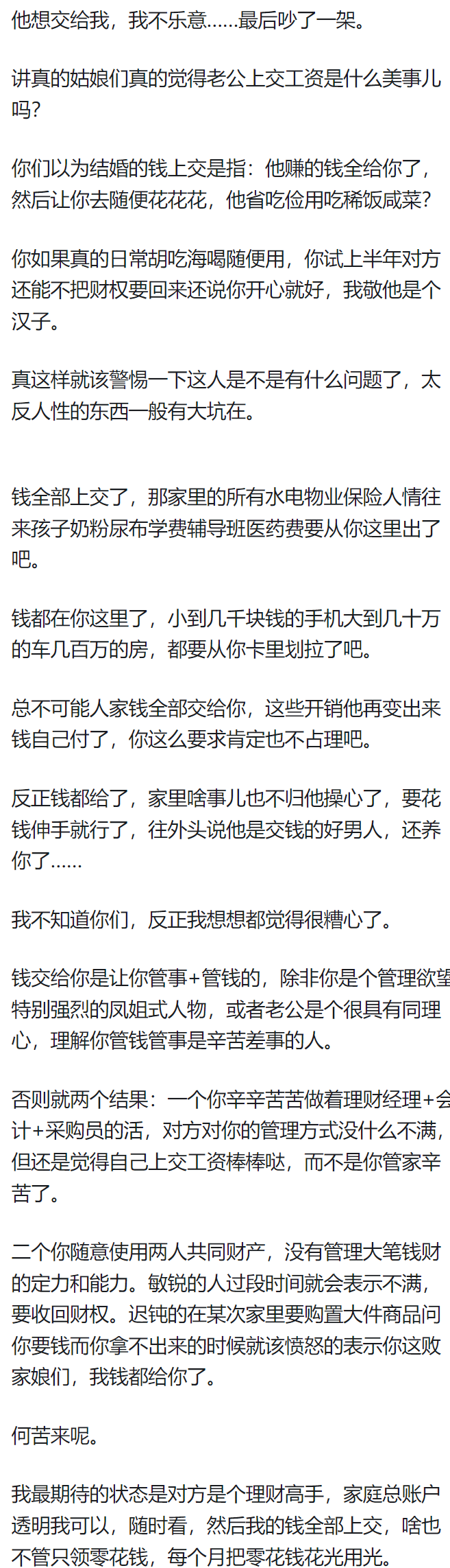 那种你的钱是我的钱,我的钱还是我的钱的不适合当老婆,是我的话早就把她开掉了我觉得上交工资的本质不是上交,而是钱放在一起。我老公之前钱都给我,最近两年我钱都给他,我俩都是这么认为的,所以从来没有任何矛盾。
