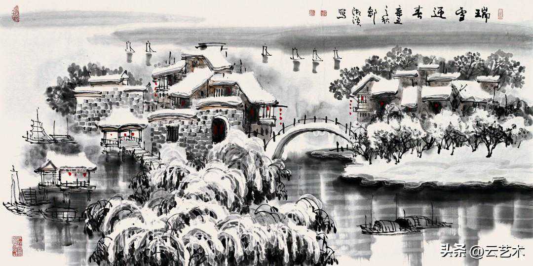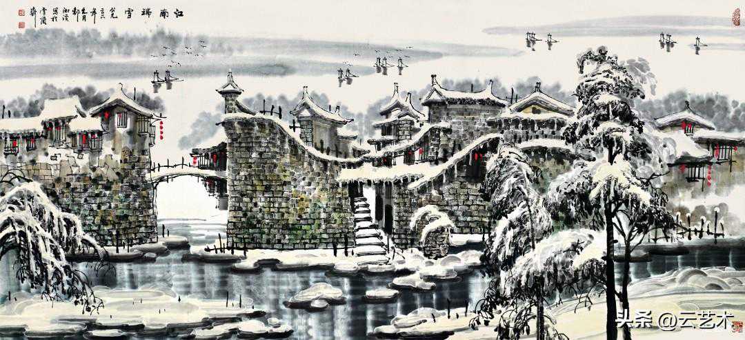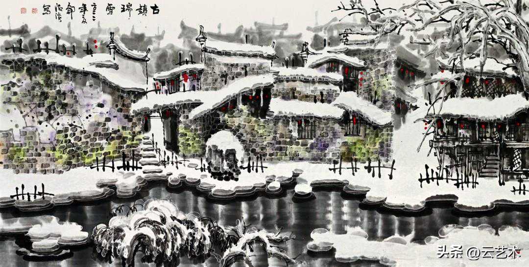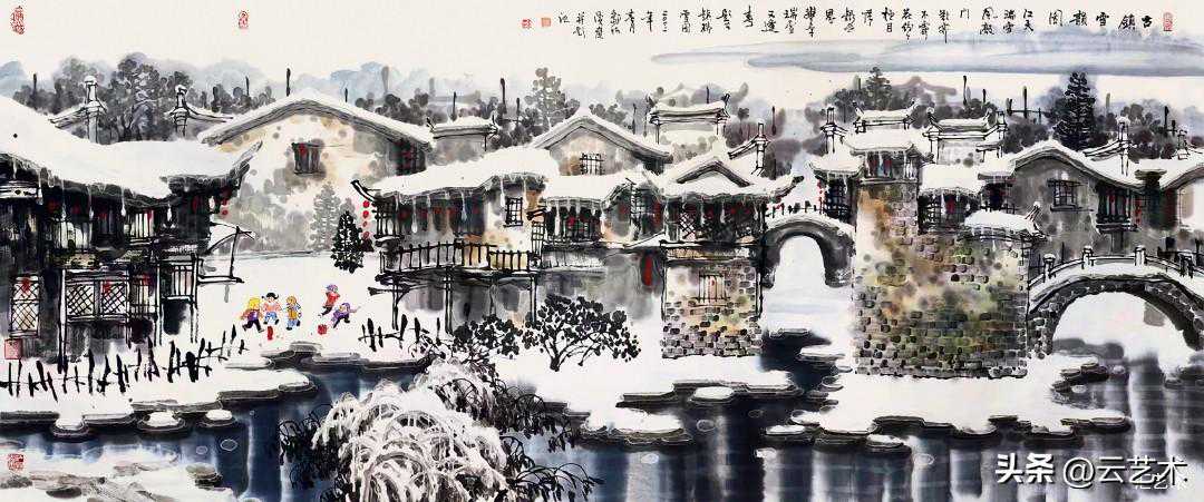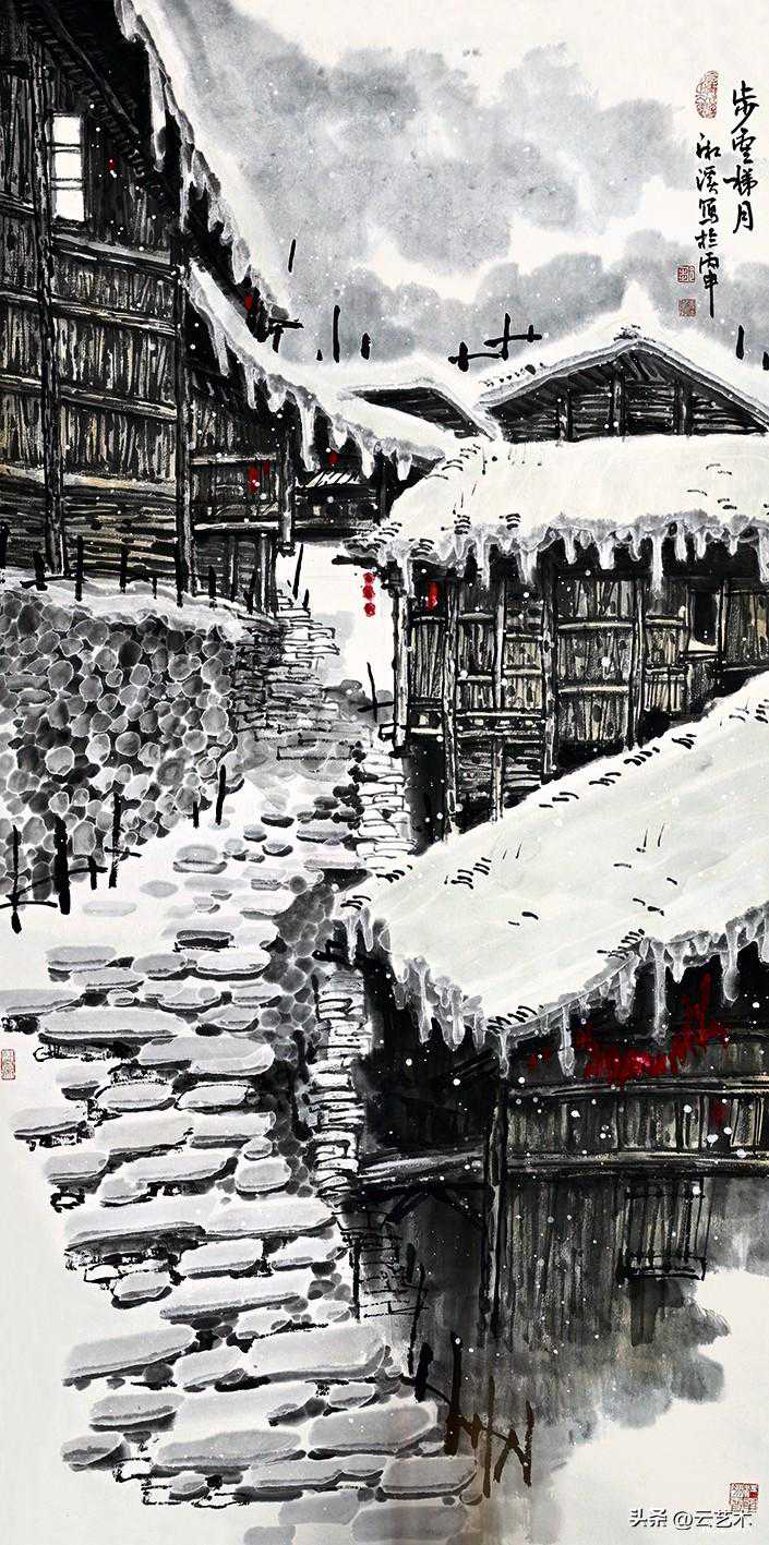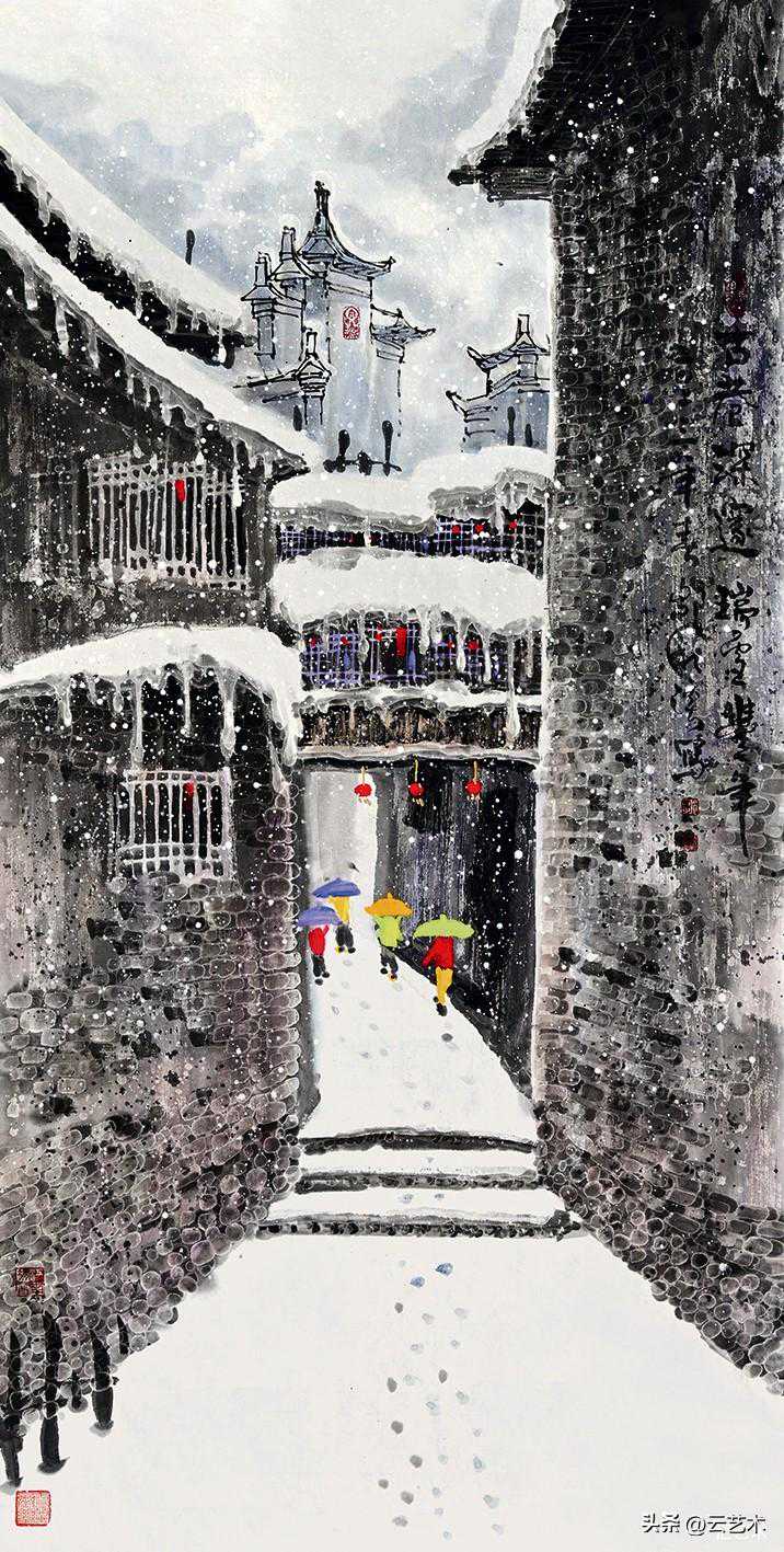 因此受到画界收藏的青睐,江南冰雪画先后到北京、甘肃、山东、山西、新疆、上海、江苏等地交流。从国内到国外,从中央到地方都有收藏江南冰雪画的爱好者,几年来已有200多幅精品被收藏,进入市场体系,可证其冰雪有品!雪赋小雅,屋檐挂玲珑,清竹摇晶莹,小巷子、石板桥,一致伴雪卧眠,成为雪后江南的画相大美!远山近水映白素,亭台楼阁落神光,灰墙白瓦含轻霜,雪画江南似天上!先生画江南冰雪,不动声,也不刻板调色,用心画,用心触,不经意间,就是山水映雪,一瞥江南成醉意的极致韵品!惊鸿回眸时,心赏不意归!