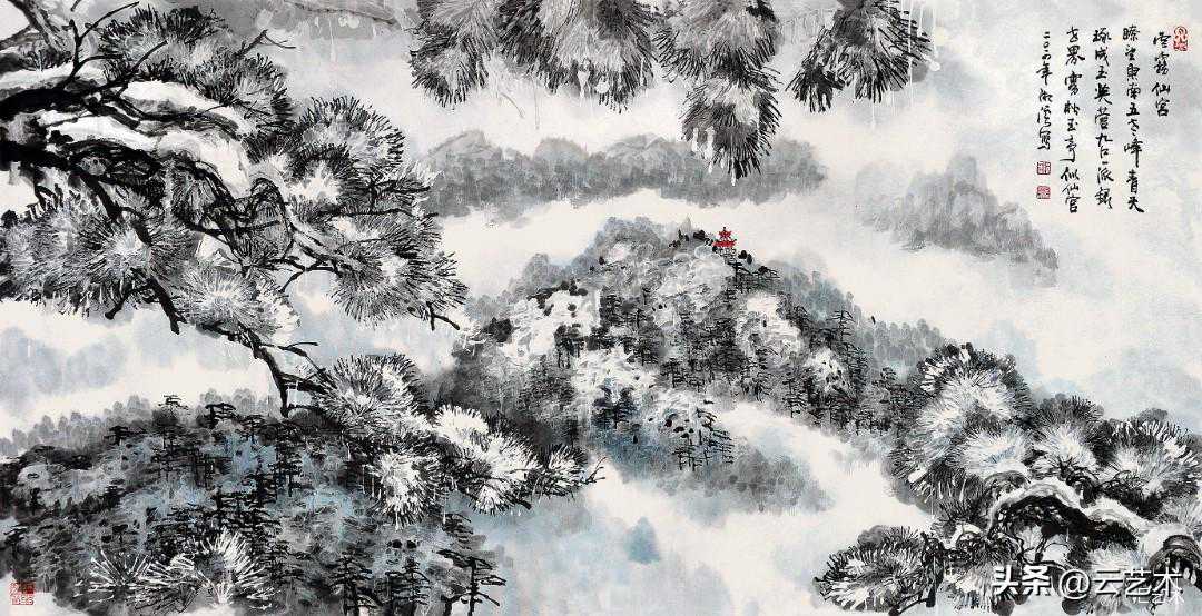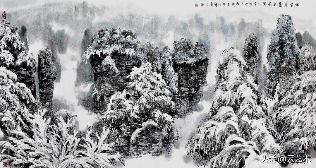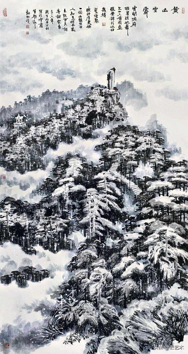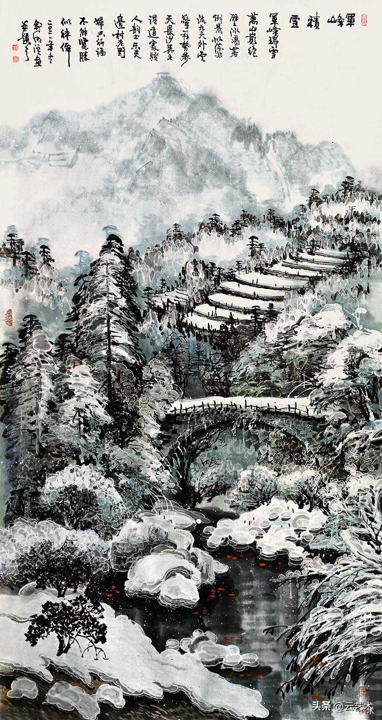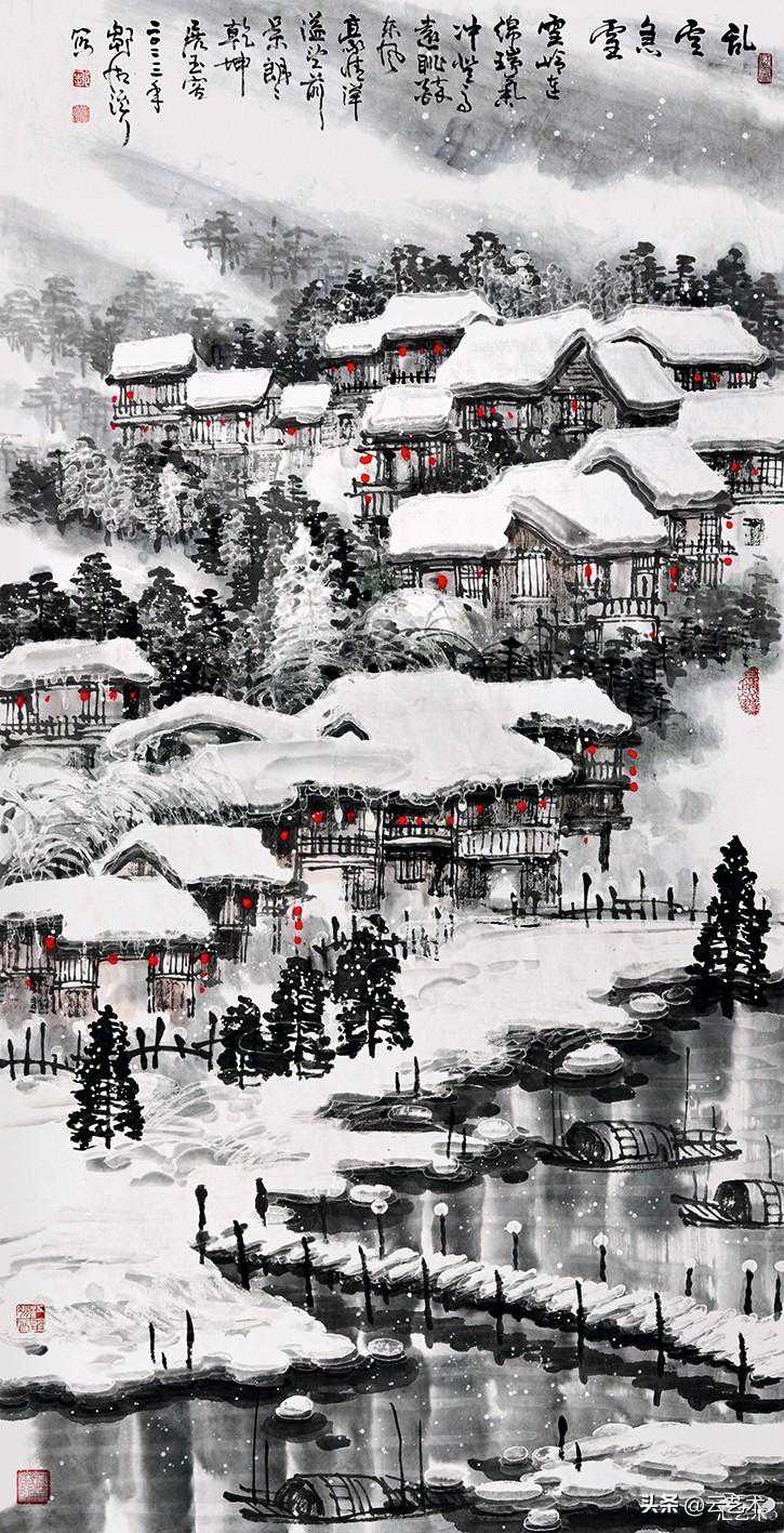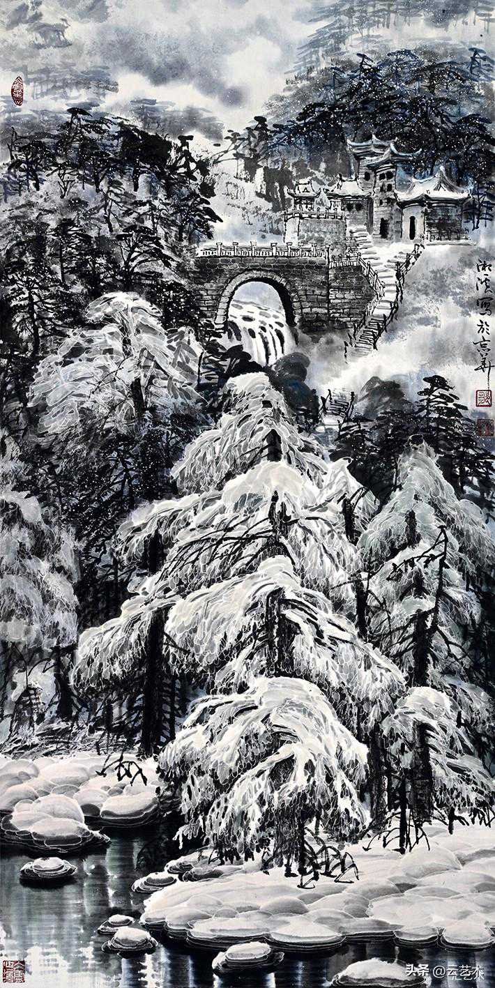 焦墨积染层层,江南山水有青绿,这是常态,但是江南山水被他用焦墨积皴打开了另一扇窗户。冬天的江南山,带着青绿,也携着钢打铁铸,真正把壮阔与丰富的神韵融合在一起,形成了浑厚华滋的笔墨意象,然后再用留白的空间布置,让雪在“空”的意境里,不断收益“灵”的身姿!这空与灵的收获,就是写生不辍的积淀,每逢江南雪,他必执笔去写生,不遗余力地发现江南冰雪大美,曾经感叹“北国风光无限好,江南冰雪更迷人”。