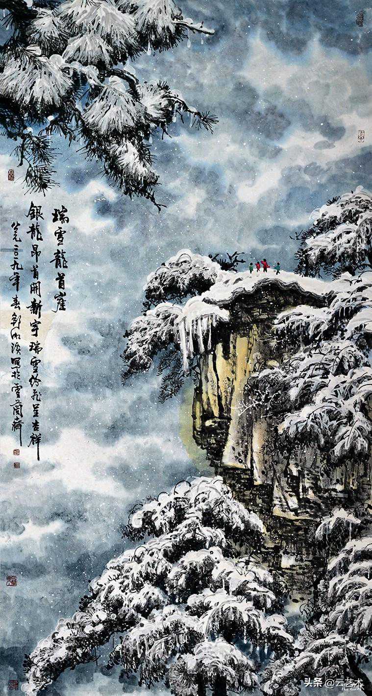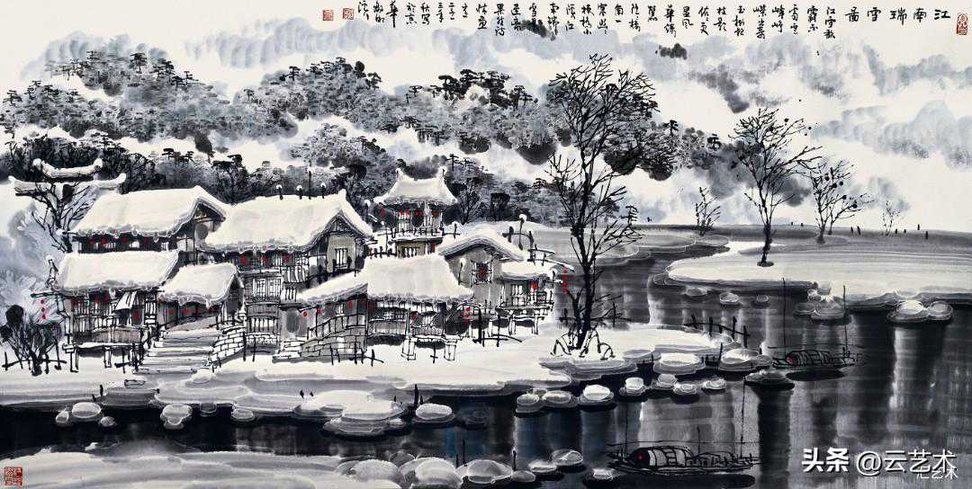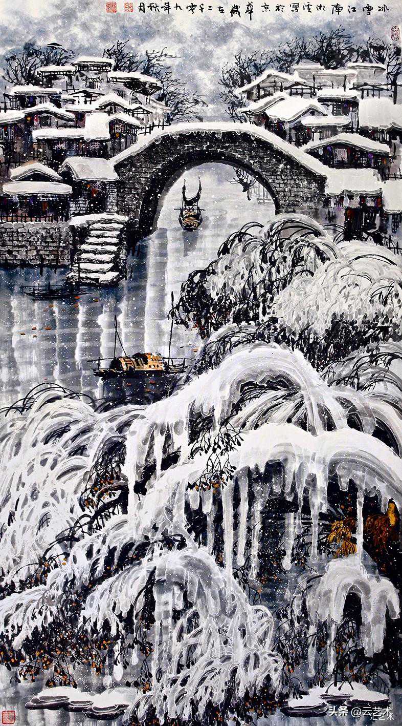 轻舞玲珑江南雪,绝尘世外画佳境。不知道还能不能再找到一位画江南冰雪,能画到似唐诗、如宋词般的画家。深切地感知到,能在艺术欣赏的道路上,遇到这香雪轻白落江南的笔墨神品,已经深感幸莫大焉的极致喜悦,银装素裹,负雪小亭,千岩映霜,引人卧游!看到这么美的冰雪画,心不想诗都感觉不可能!这江南冰雪画第一人的大功名,恰是小舟缆系驻江南的修养从容!画如其人,大家风范!