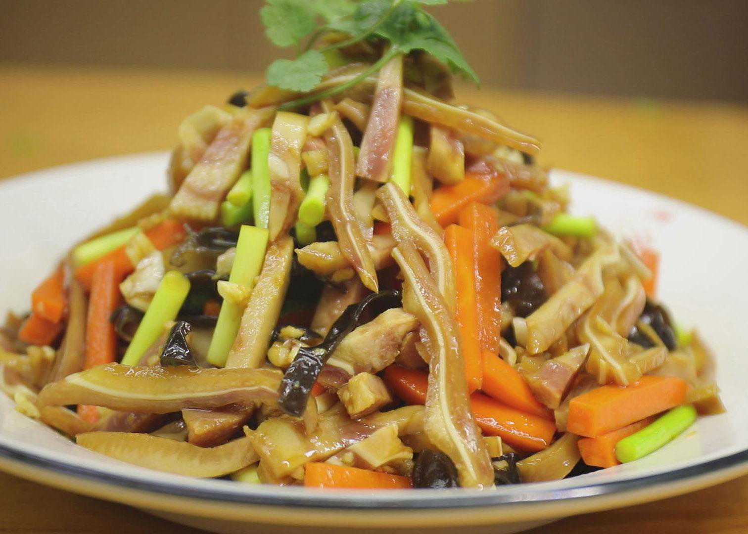 第三、【凉拌猪耳朵】凉拌猪耳朵少不了配菜,如今的蒜苔还新鲜,就用几根蒜苔、胡萝卜丝、几片黑木耳来做配菜。条件好的猪耳朵单拌也行。