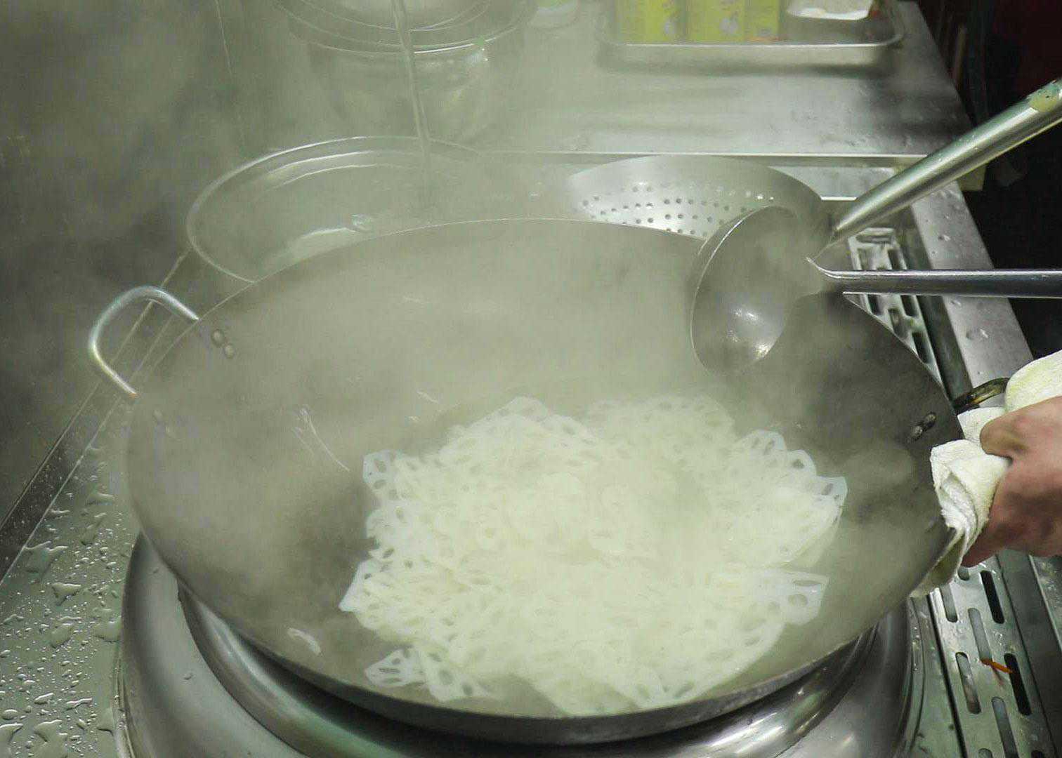 用勺子一携捞,赶紧起锅倒出来。快速用凉水过凉藕片才能更脆爽。