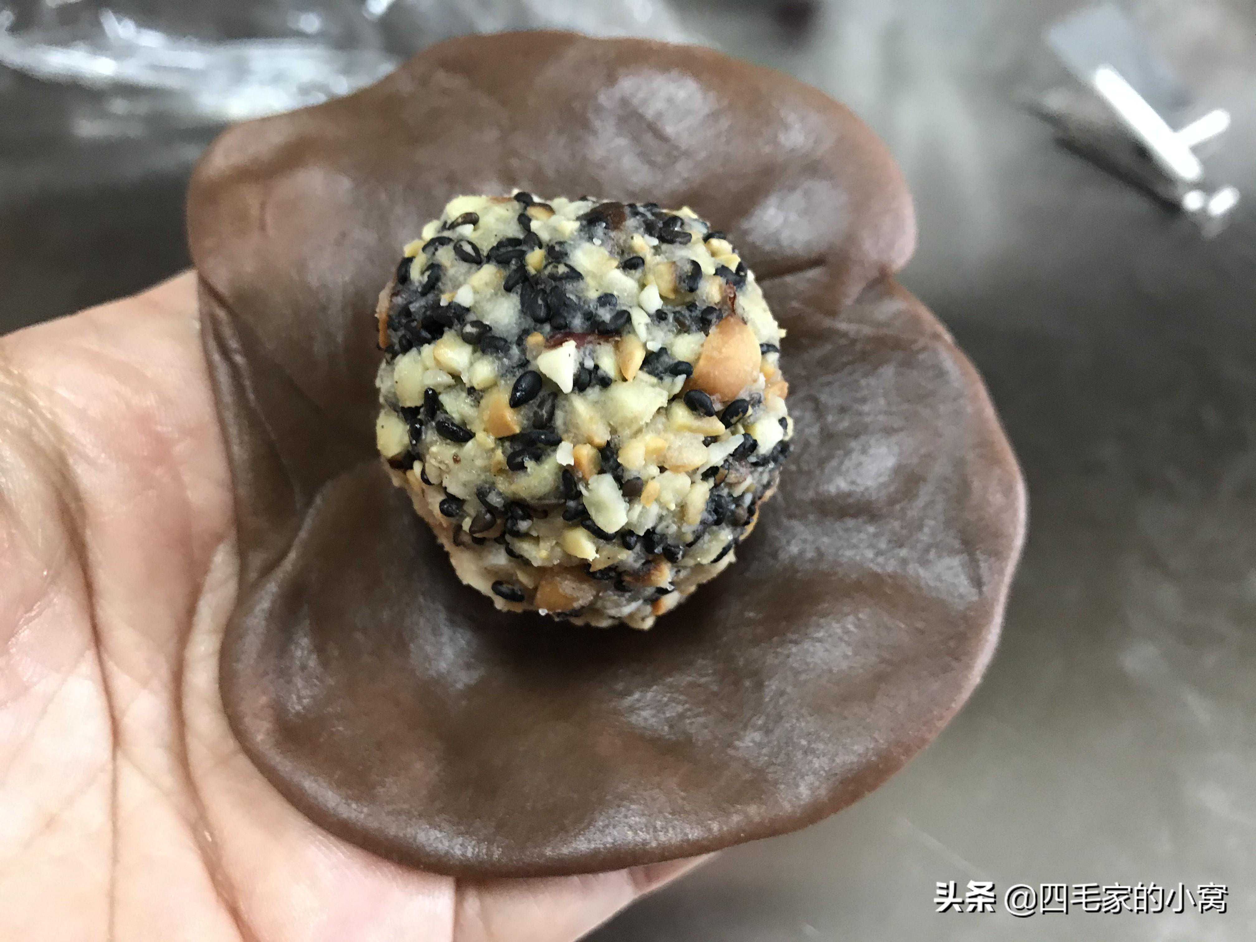 制作方法:首先制作馅料部分,花生放在上下火150度预热好的烤箱中,烤7-10分钟自己看状态,烤的过程中会啪啪响着很正常,烤好晾凉后用双手一搓,花生皮就掉下来了,然后用擀面杖把花生擀碎,偶尔有大一点的颗粒是很正常的,这样吃起来口感才好。把坚果馅料所有原料全部放进一个盆里,黑芝麻要买熟的,直接用就好了,拌匀后用手攥一下,只要能抱团就可以了,然后把馅料按自己需要的重量,分成剂子攥成圆形备用。