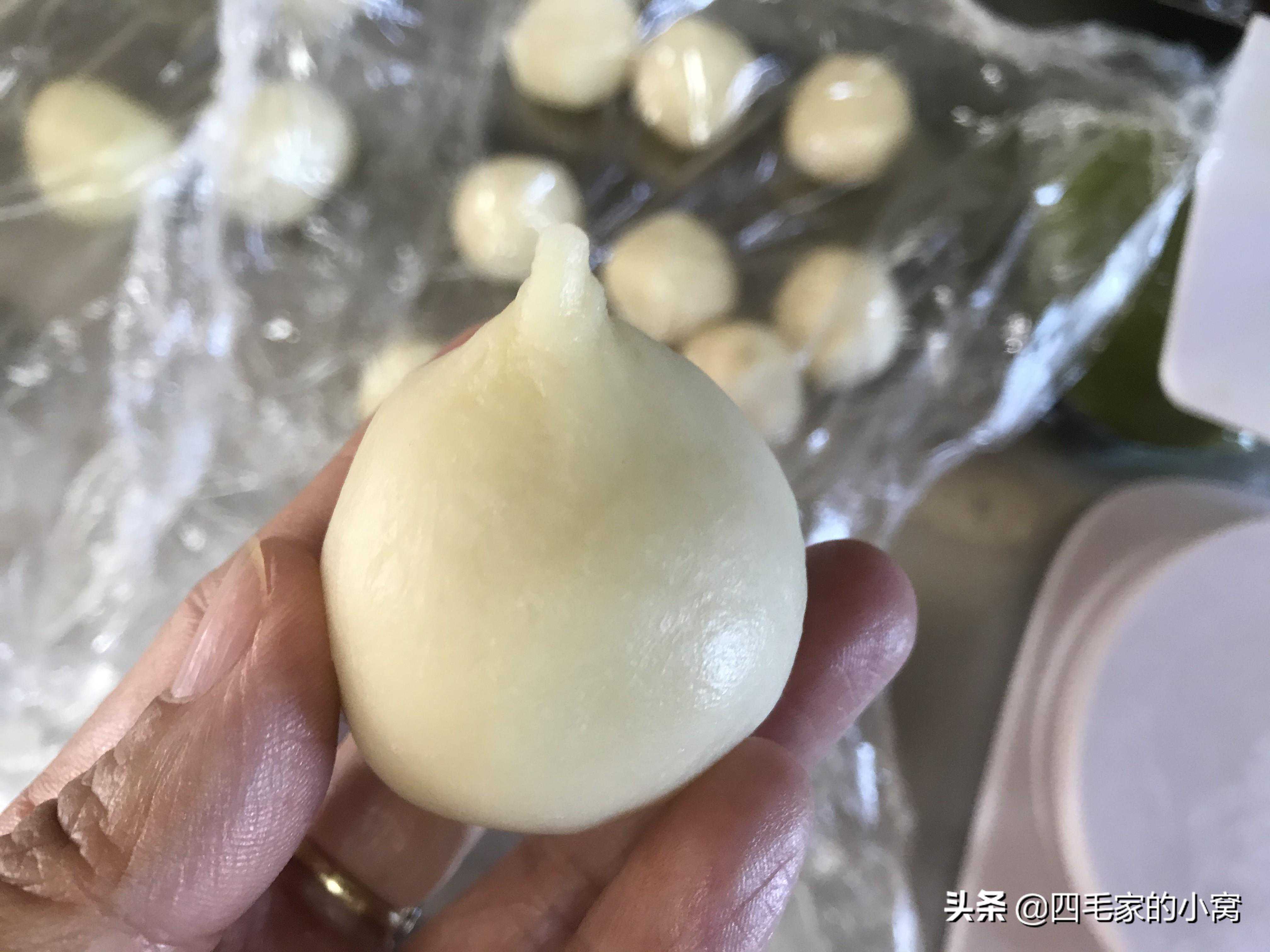 小贴士:粘黑芝麻时可以借用一只筷子,先用筷子头粘一点水,点在眼睛部位,然后用筷子头粘一粒黑芝麻,点在眼睛的位置就可以了。