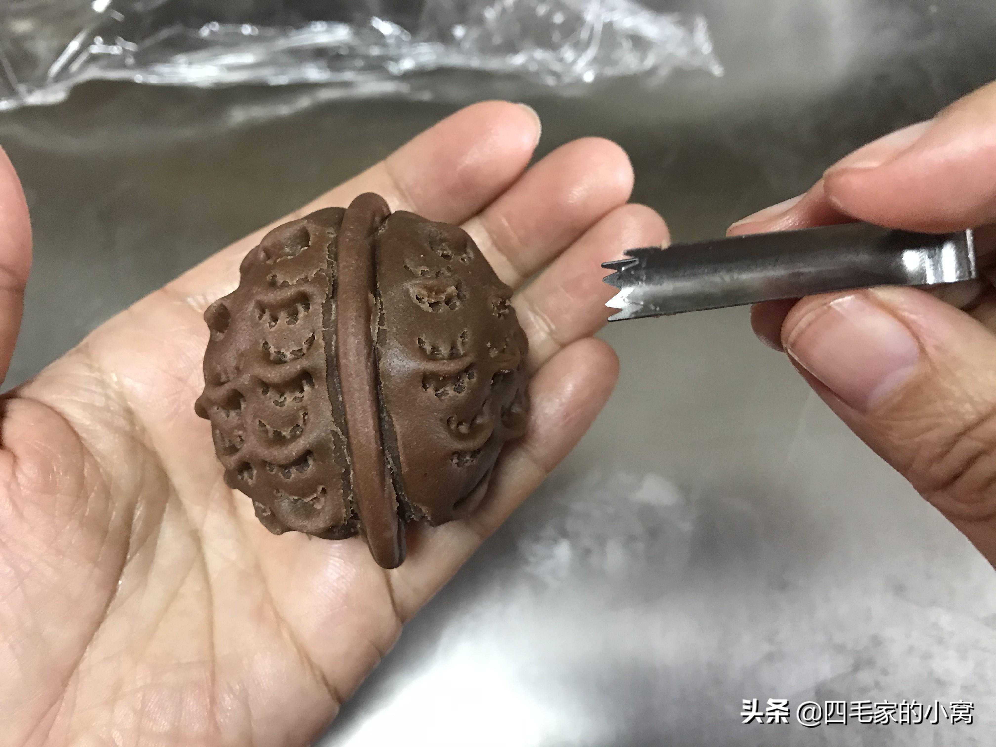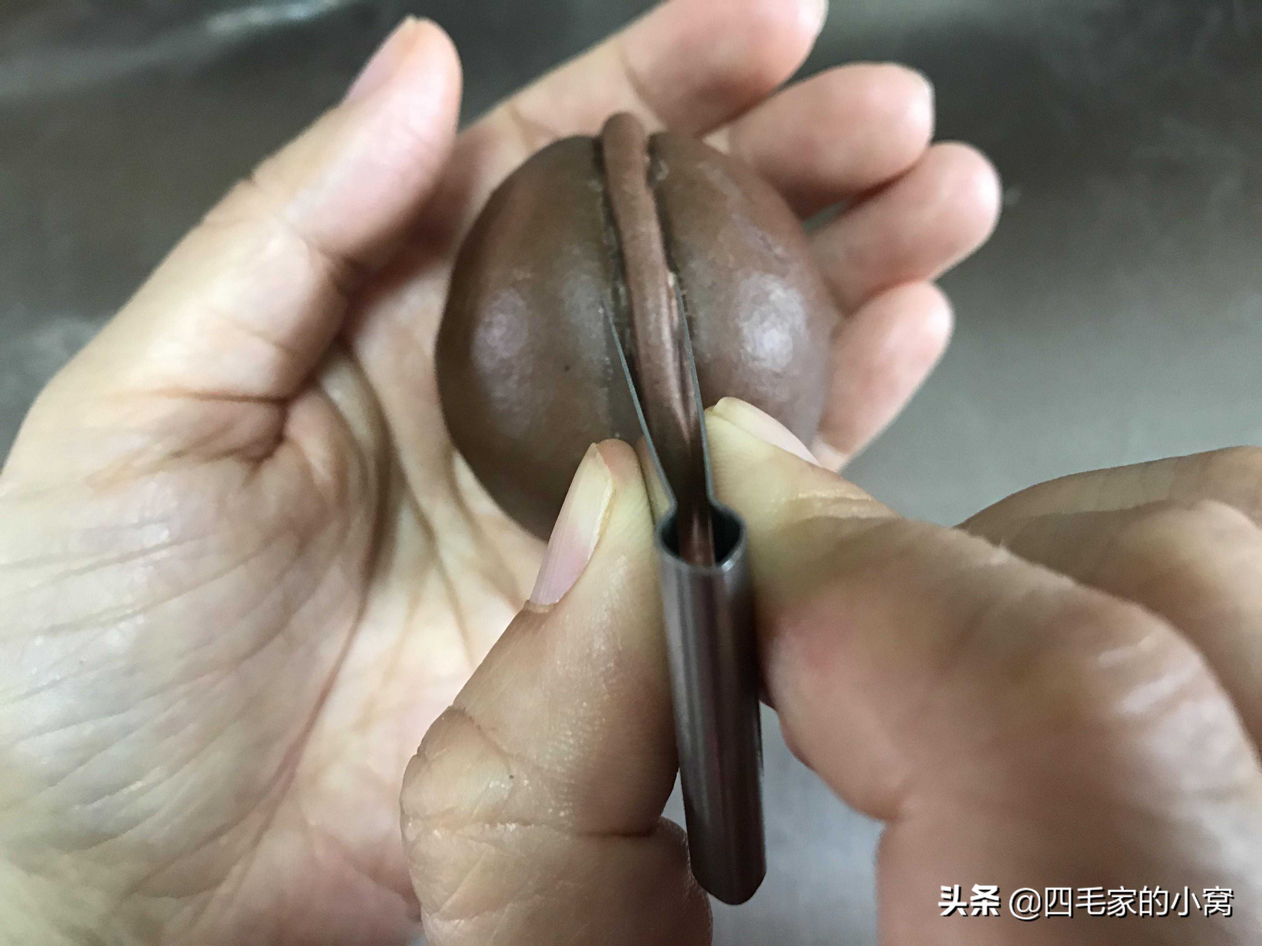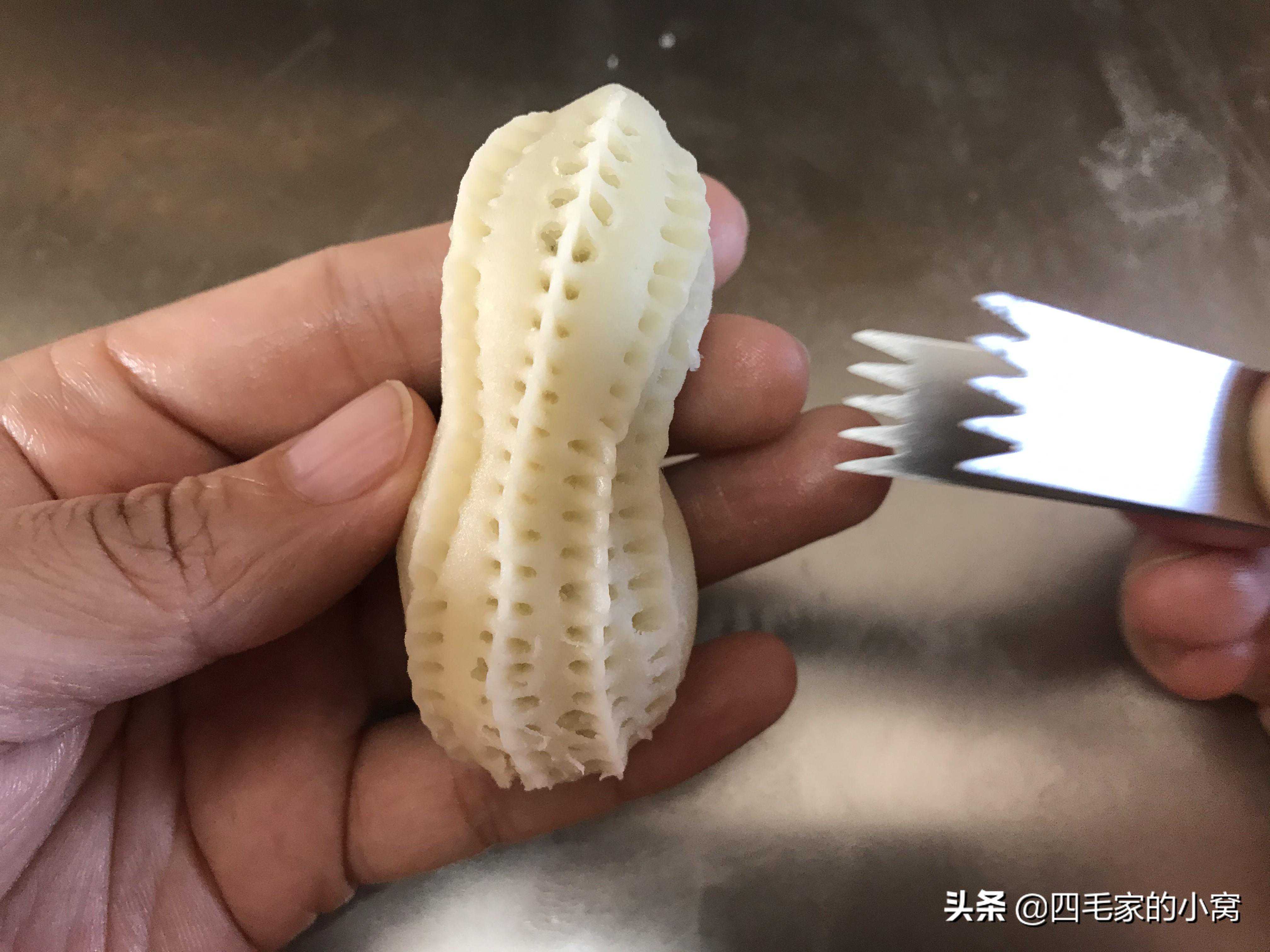 花生酥我用的基础配方,按核桃酥的配方去掉可可粉就行了,面剂子和馅料都用核桃酥的一半量就好。开酥部分还是一样,两次开酥后把面团从中间切开,用一半的面团量就可以了,把面团两端切口处先收紧,再用擀面杖把面团擀成中间厚四周薄的圆形,包入馅料收紧口,收口朝下把面团捏成一个,中间有收腰的类似葫芦的形状,然后用6号夹子从上到下,捏好一条再捏一条花纹,平行着捏3-4条花纹,花生造型就做好了。