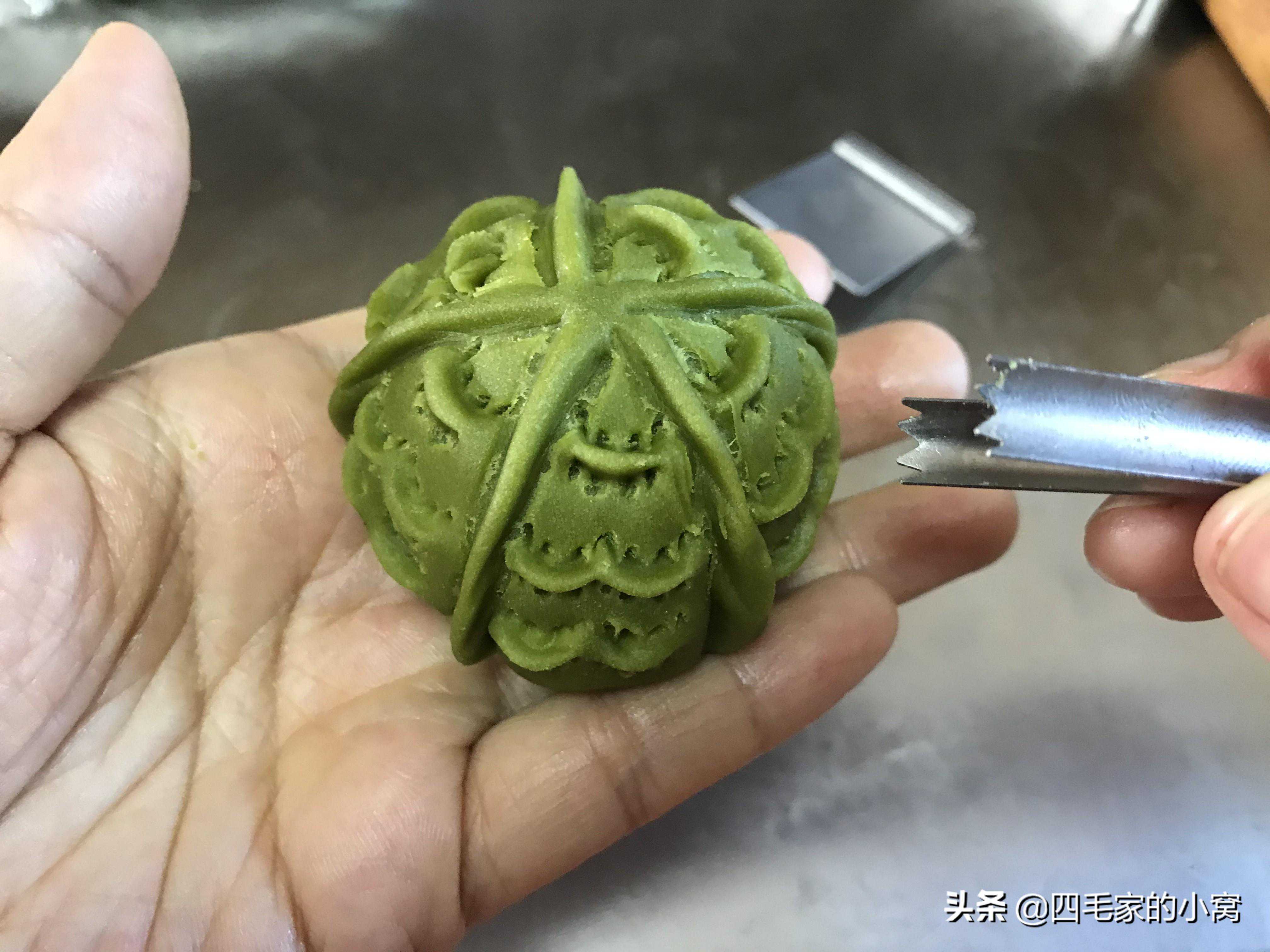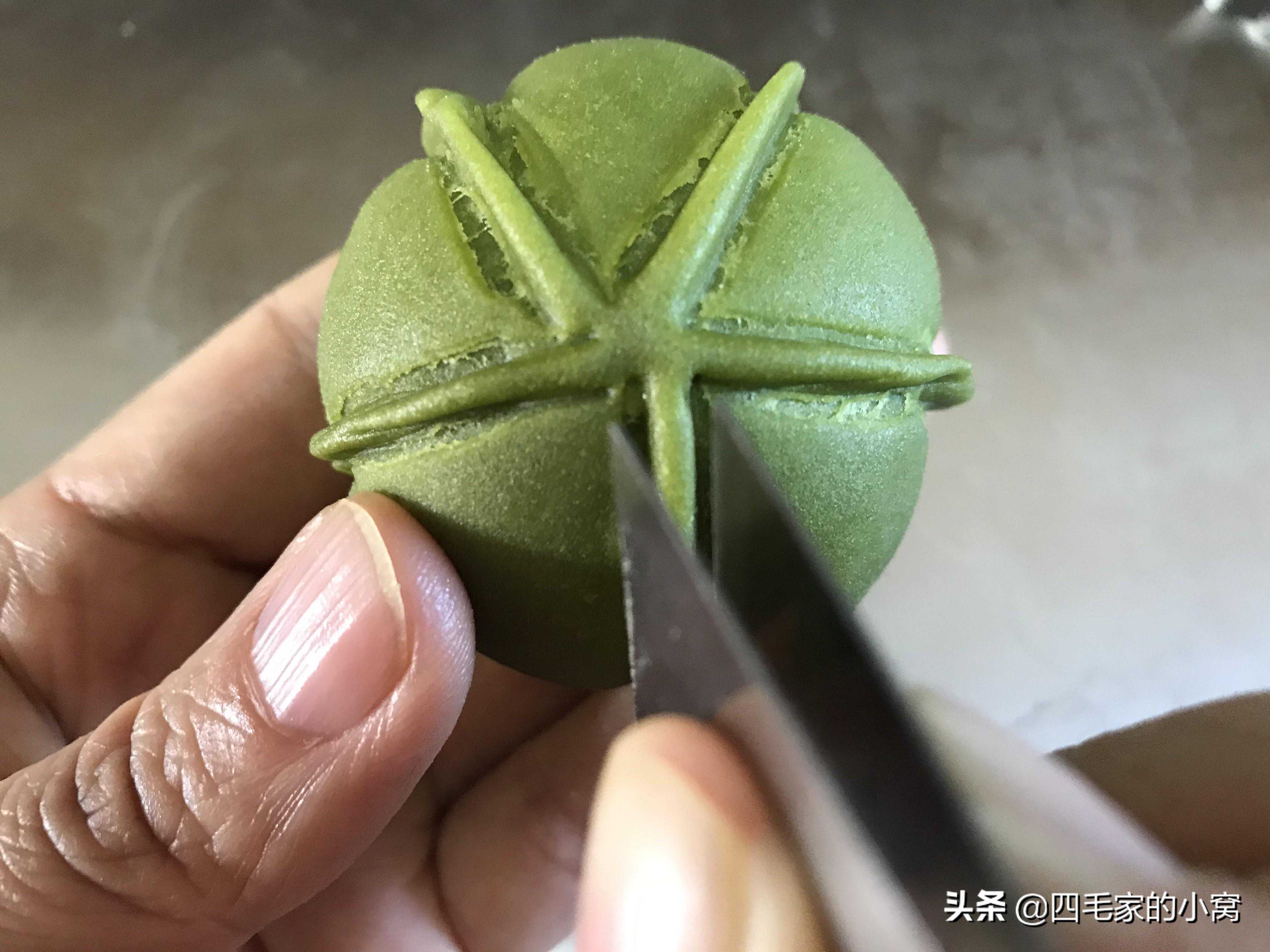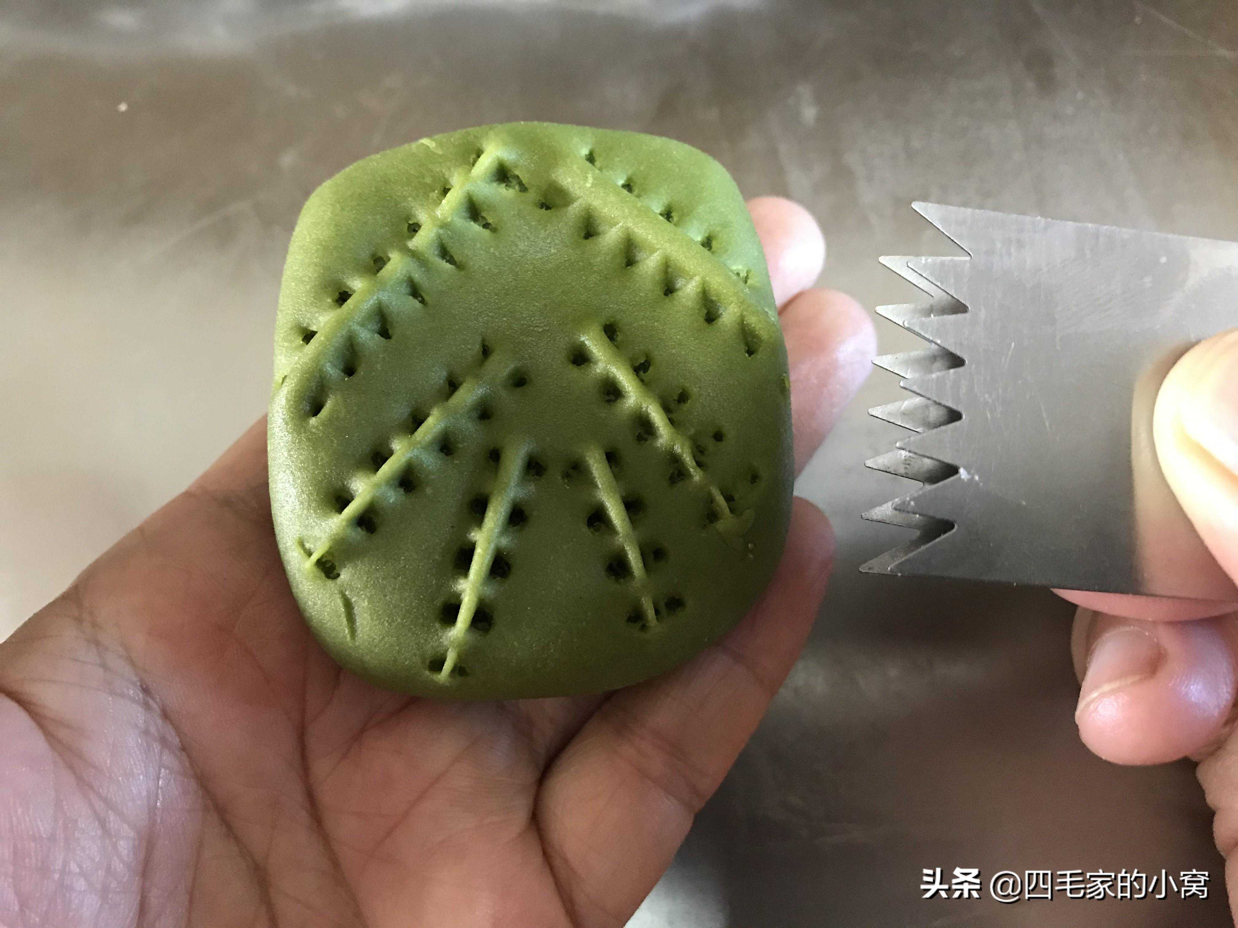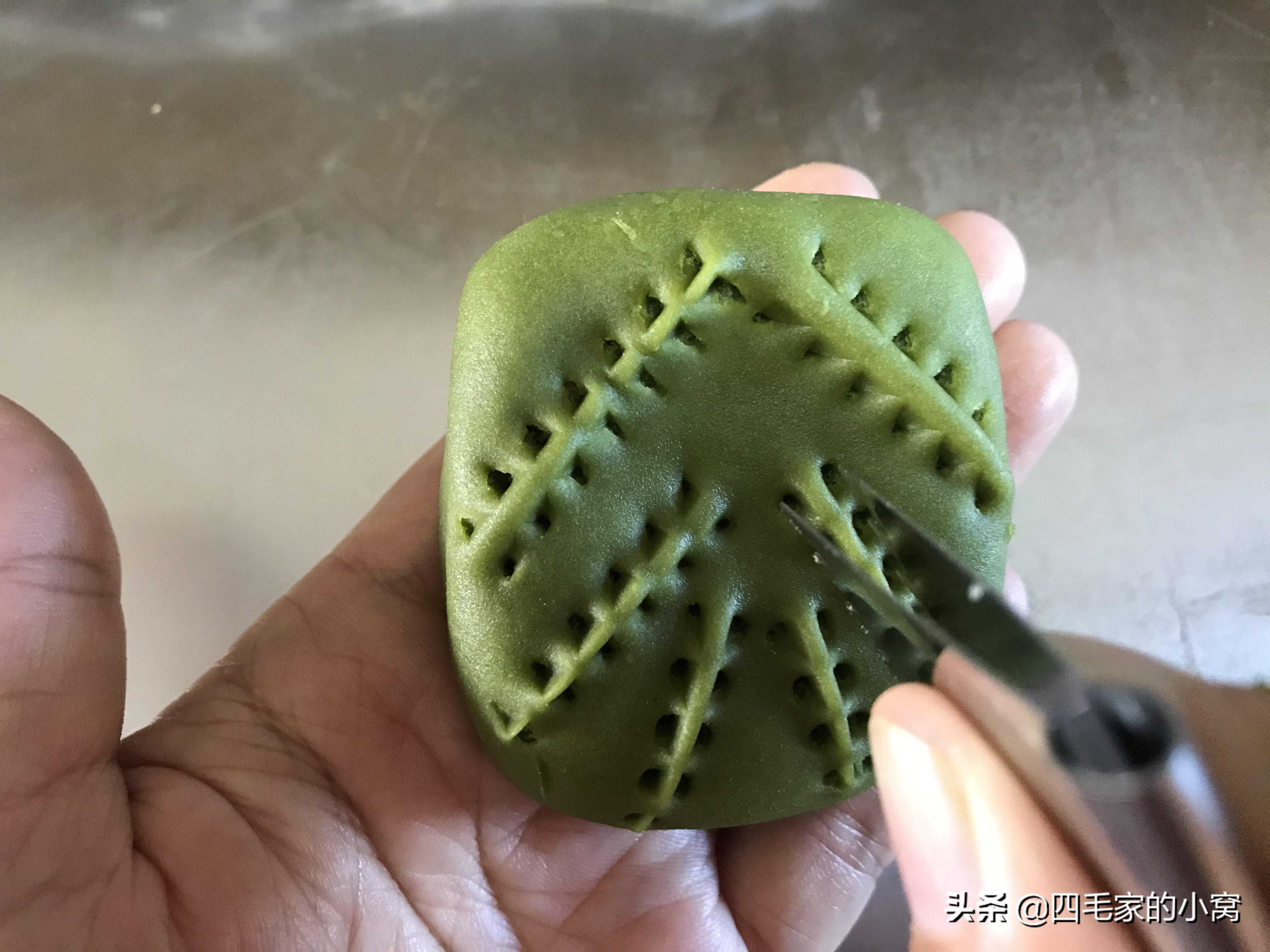 这个用的也是抹茶面团,包的红豆馅料,我们包好馅料,把面团捏成水滴状,一头尖一点的样子,用4号夹子先在面团中间竖着捏一道花纹,然后分别在两侧对称且平行着,捏几道纹路就可以了。烤箱提前预热好上下火180度烤28分钟,出炉晾凉就可以吃了。