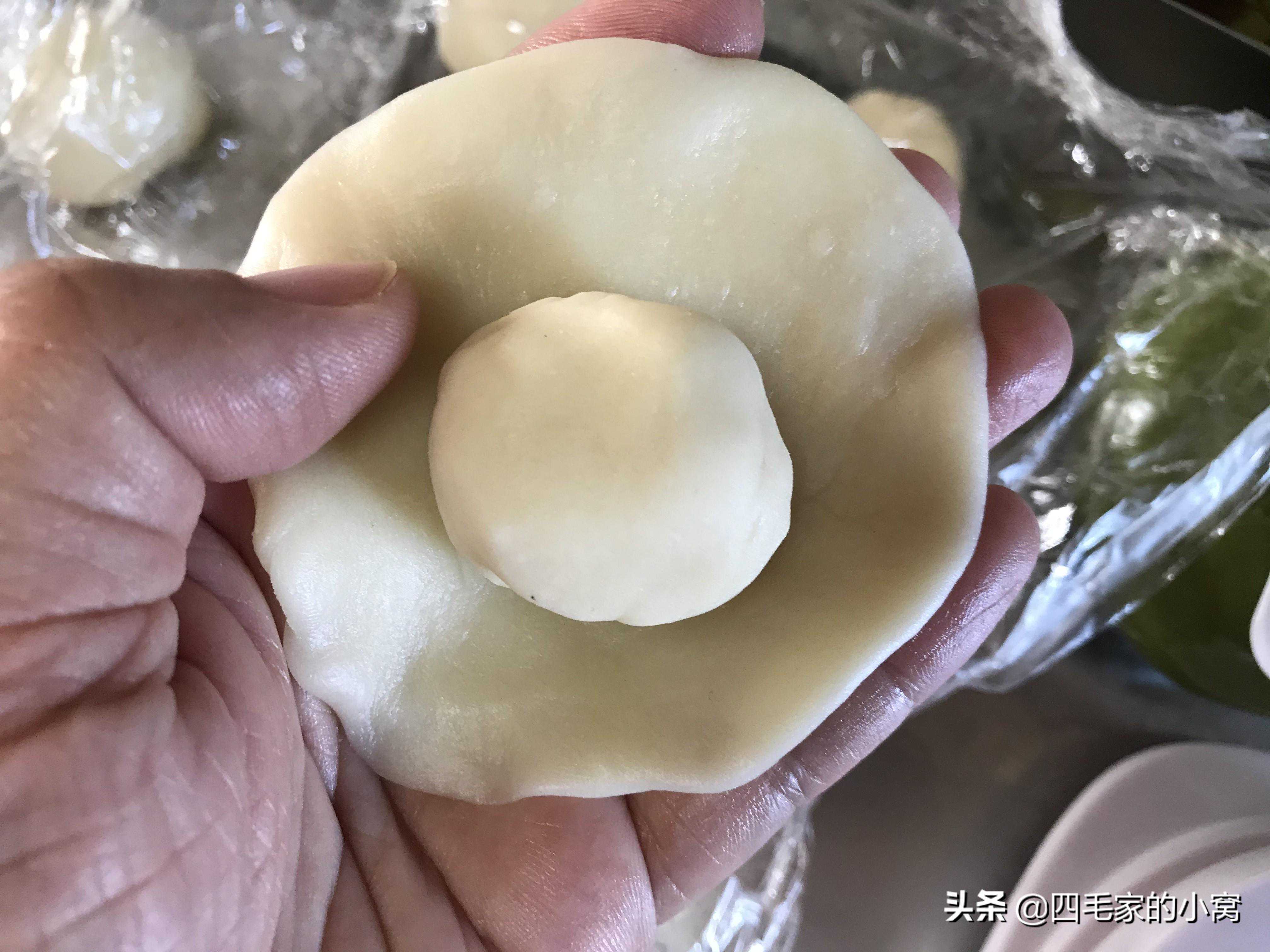 接下来我们做开酥,我这种开酥方法叫小开酥,就是一个一个分别开酥,这样虽然麻烦一点,但是家庭吃一次做的量不大,这种方法更稳妥一点。取一个油皮用擀面杖擀成中间厚四周薄的圆形,把油心放在中间,像包包子一样包好收好口,把收口朝下用擀面杖擀成牛舌饼的样子,再把擀好的面皮翻过来,让之前收口一面朝上,接着从上端向下卷,大约卷两圈半到三圈的样子,把卷好的面团放到保鲜膜下面,接着做第二个面剂子的开酥,依次都做好了,这就做好了第一次开酥。