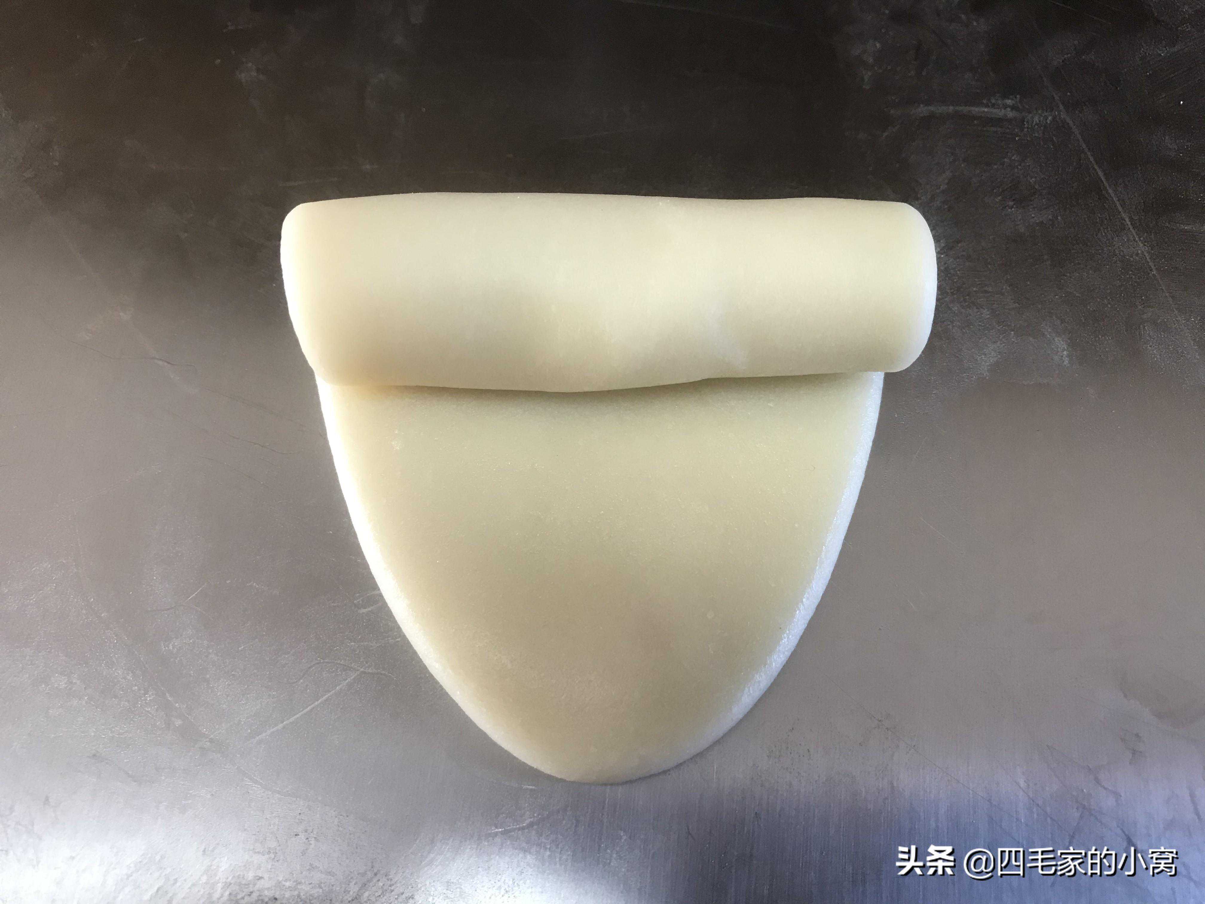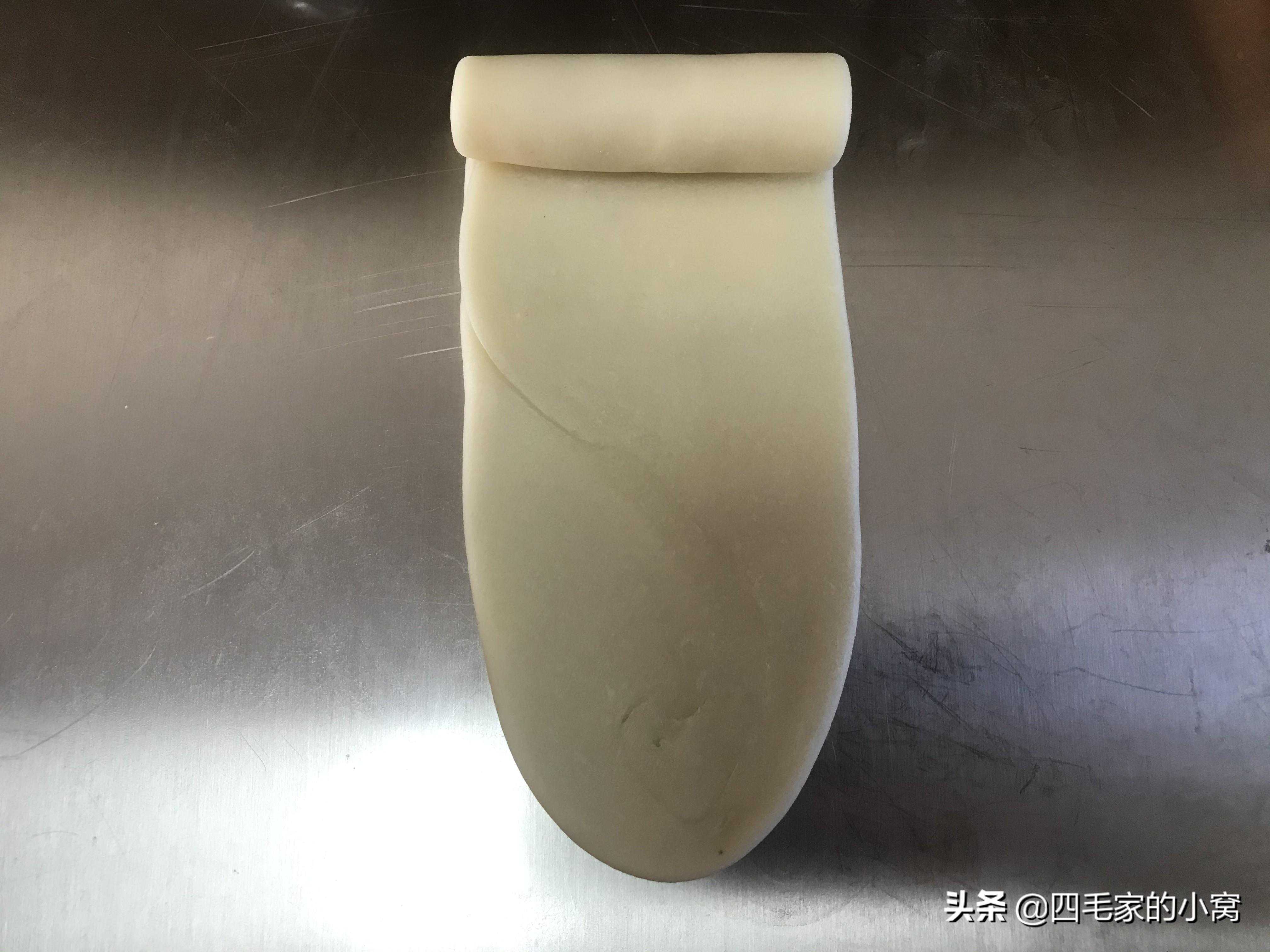 然后我们用同样的方法一次进行第二次开酥,把第一个卷好的面剂子先拿出来,把开口处朝上,用擀面杖先压两下,把卷好的卷压成三到四个手指的宽度,然后从中间分别向上和向下擀,把面团擀成长方形,长度大约10-15厘米,然后从上端向下卷,这次因为面团被擀长擀薄了,所以卷起来更紧实了,卷的圈数也会多几圈,按照这个方法一次做好所有面团,这个小开酥就算是做好了。