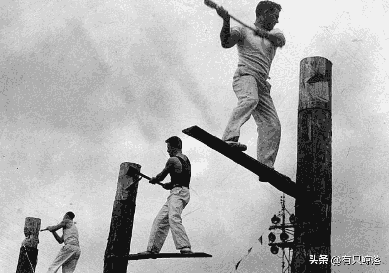 1964年,澳大利亚的墨尔本,正在举办一场节日集会。集会上竖着三根巨大的木头,木头上插着一块木板,三位木工站在木板上,手里拿着斧头,正在给观众表演,如何在半空中劈柴,这也是为了展示他们高超的砍柴技术。