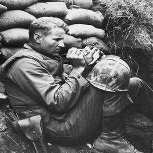 海军陆战队中士弗兰克·普雷特正在喂养一只孤儿小猫。