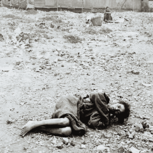 一位在战火中受创的女子弯曲地倒在地上。