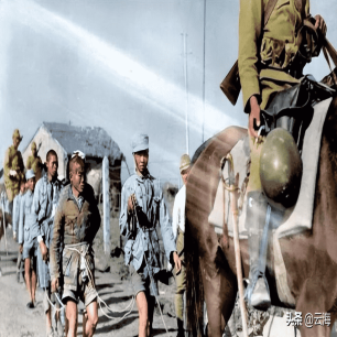 一队中国士兵不幸成了日寇的俘虏,这些中国军人被日寇用绳子绑在一起,他们还打着赤脚。