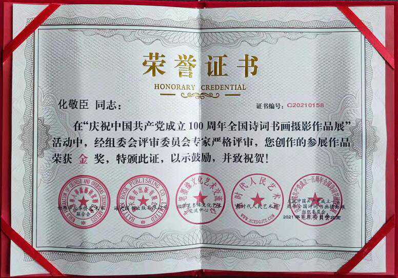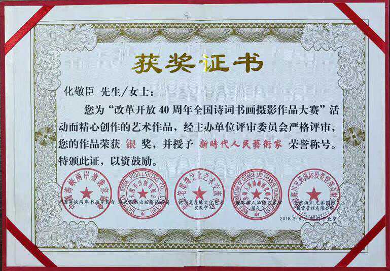 化敬臣:1944年生,系中国书画文化协会名誉主席,华港书画文化研究院理事,山东省书法协会会员,中国当代红色爱国艺术家。