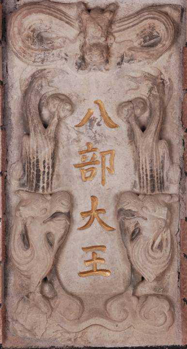 此碑呈长方形,长148厘米,宽76.5厘米,厚约20厘米。正中阴刻楷书“八部大王”四字,两边浮雕对称两条神龙,上部正中浮雕图案为一龙,下部为云水纹饰。保存完整,造型古朴粗犷,极具少数民族特色。