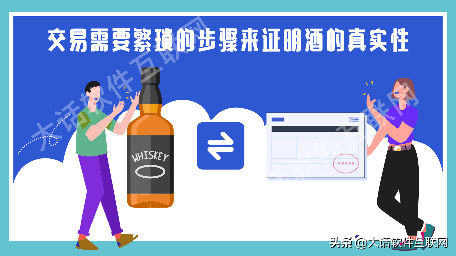 比如过去你手上有一瓶酒,这瓶酒很珍贵全世界只有你手上有这一瓶,如果过去的话别人要买你手上这一瓶酒的话,他会要求你拿出发票或者其他证书来证明这瓶酒就是真的,不是伪造的。当然后续他要交易的话它也需要这些繁琐的步骤来证明这瓶酒的真实性。