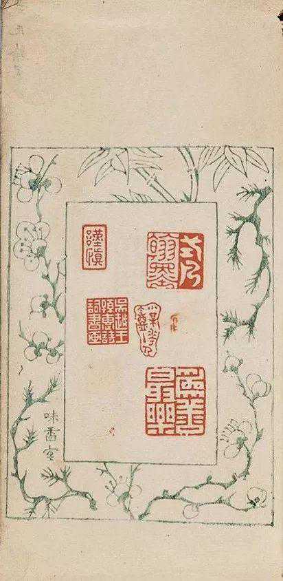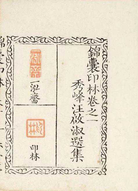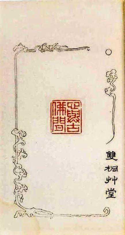文人思维从文言雅语入印始,经发展延伸至印谱刻印的版框纹饰设计中。利用版框纹饰来表现文人思维,发展甚为缓慢,清初以前,印谱版框纹饰无甚大改变。至清乾隆十七年(1752),始有突破性发展,现在所能见到“文人画”理念融入印谱版框中者,首先是汪启淑(慎仪)乾隆十七年辑成之《汉铜印丛》,成谱于乾隆十九年(1754)之《锦囊印林》及成谱于乾隆二十三年(1758)之《讱葊集古印存》三谱。以上三种印谱的版框纹饰,打破了传统古籍中单栏、双栏格式,《汉铜印丛》首先采用松、竹、梅三友图纹,《锦囊印林》采用卷草纹,《讱葊集古印存》采用双龙纹作为版框纹饰。此三种印谱版框纹饰面世,令人耳目一新。自汪启淑这三种印谱始,印谱版框纹饰发生突破性发展,由乾隆后以至民国期间,印谱版框纹饰出现百花齐放、百家争鸣局面。