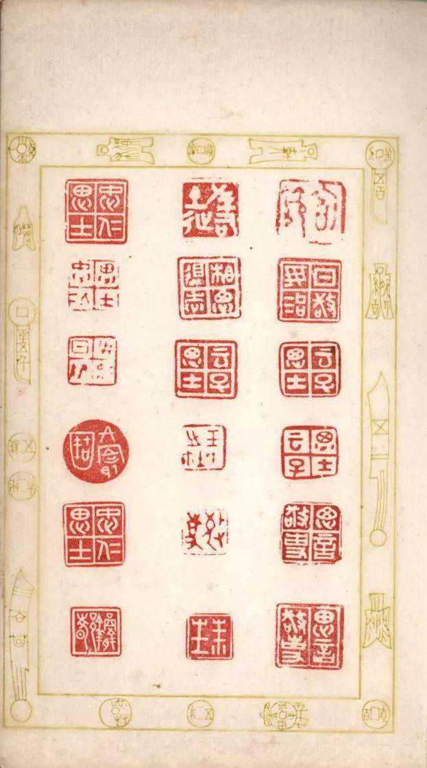 印谱作为古籍的一个门类,继承了版框的形式,并发展出多样化的纹饰,既具有实用功能,也增加观赏功能。一般来说,版框对于刻印叶面具有规范作用,与没有版框的古籍或印谱相比较,有版框纹饰者版面更整洁,视觉上更平衡、稳定,读者的视点更能集中于内容部分。存世印谱中,有以无版框印谱纸钤拓者,这种无版框印谱存世量应不少,但是,不论钤拓如何精良,排列如何有序,仍缺乏整齐划一之感。而有版框的印谱,采用细线单栏或双栏的,使人感觉秀丽、庄重而清新自然;采用粗线单栏或双栏的,有厚重及严肃的感觉。在传统的单栏或双栏版框纹饰中,文人墨客又稍加改变,将版框四角稍稍改动成圆角,这一小小变动,使版面活泼灵动,流畅圆通。